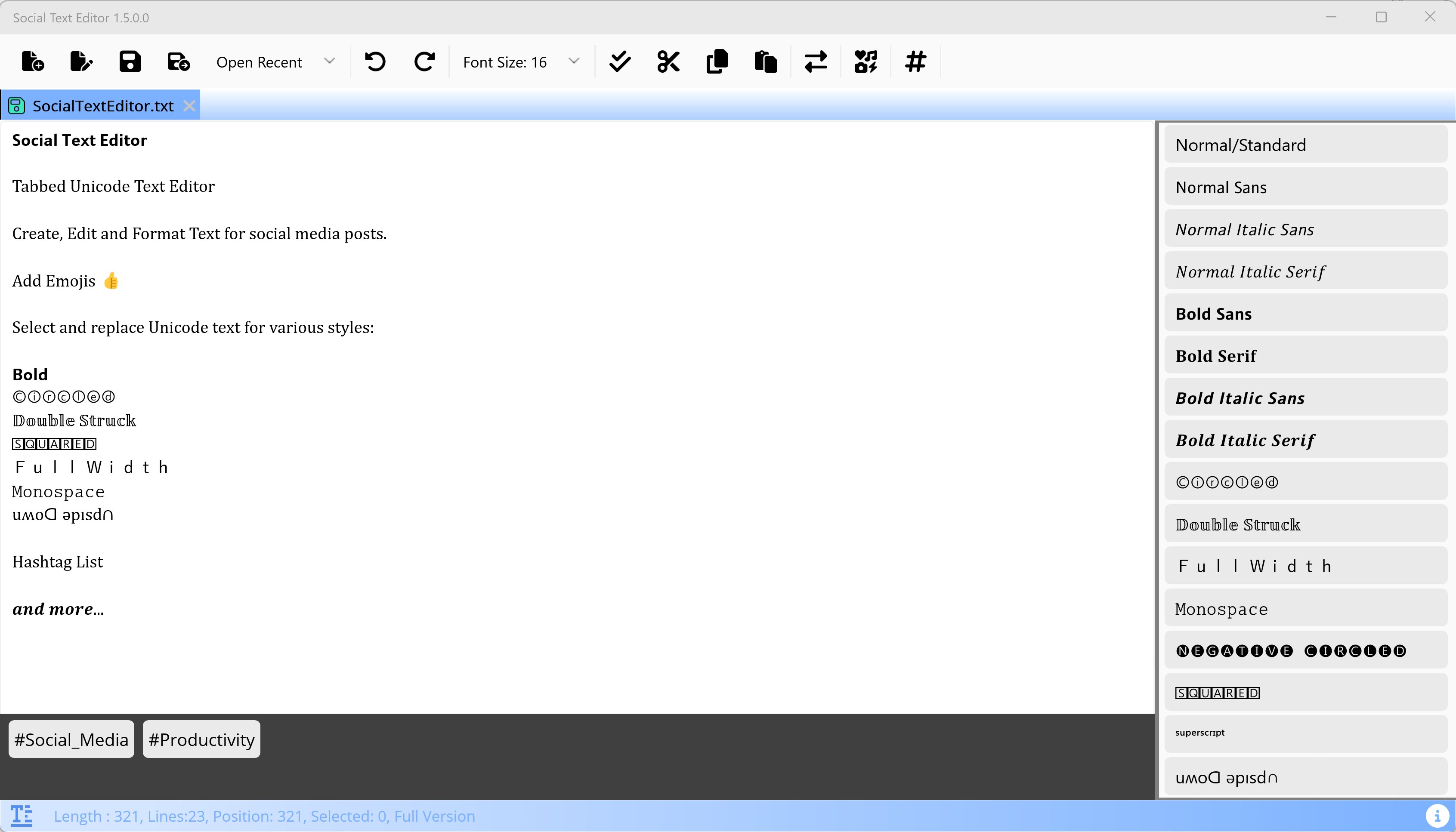 Text Editor to create formatted text for social media postsAbility to Save and Open FilesFont Size SelectionSelect All, Cut , Copy , PasteMultiple Text StylesTabbed Interface to open multiple filesSupports Operating System Light/Dark modesHashtag List to easily add hastags to content