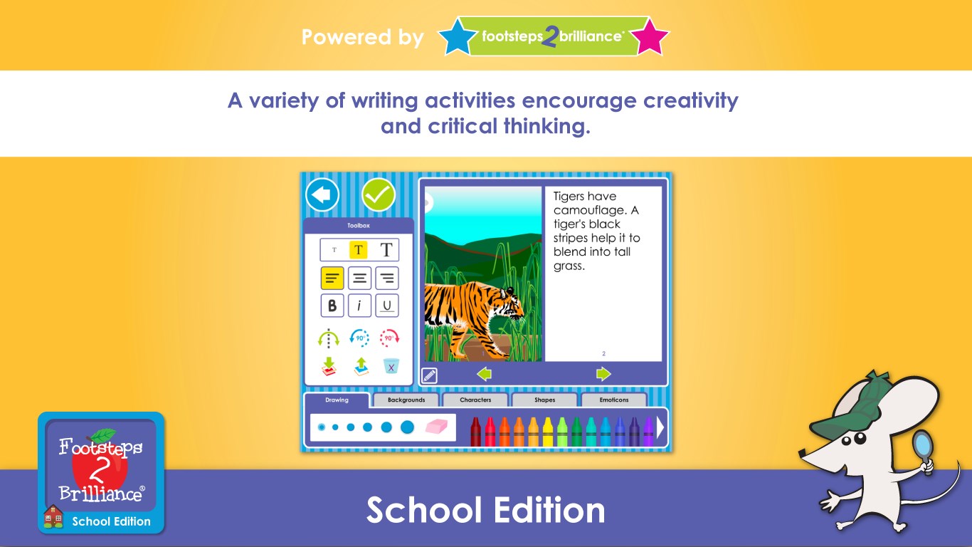 "Footsteps2Brilliance®, Inc. is a delightful way for children to experience the beauty, enchantment and rich literature of books using technology. Behind the child friendly format are abundant resources for parents and teachers to use to gain insight into a child's cognitive development and language acquisition."