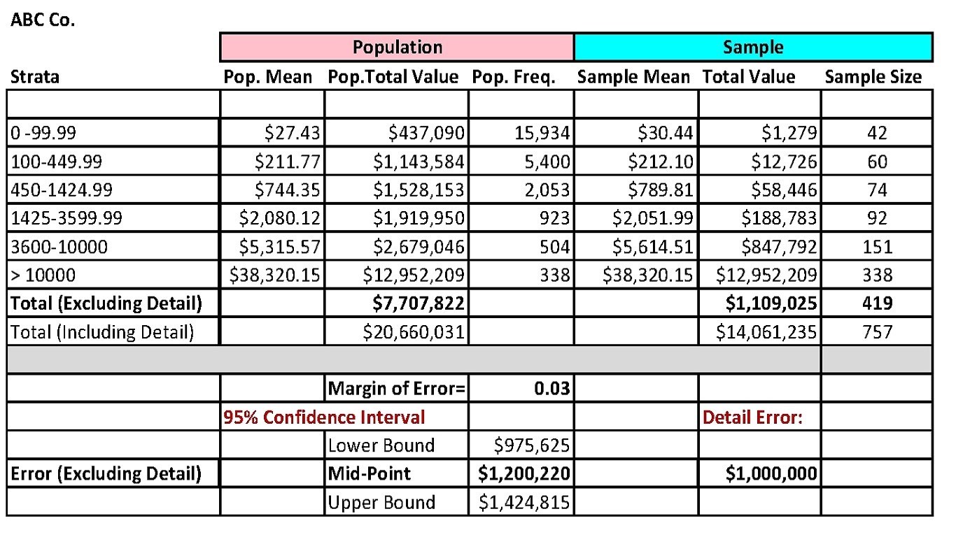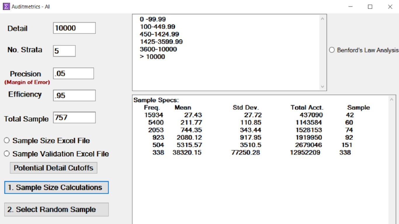 All of this is done in a user-friendly environment such that one can traverse the complexity of the statistical audit by using a simple three step process. Each step has a series of computer guided analytic checkpoints. An auditor can let the software establish sample specifications but there is ample opportunity for the auditor to fine tune the final design. Once a design is accepted, a random sample of the account is generated. The AI system also generates Excel templates that can be used to document and record audit results.
