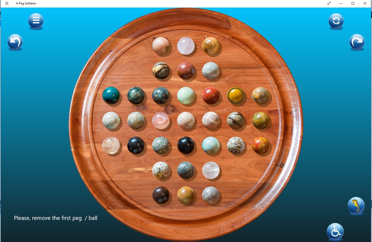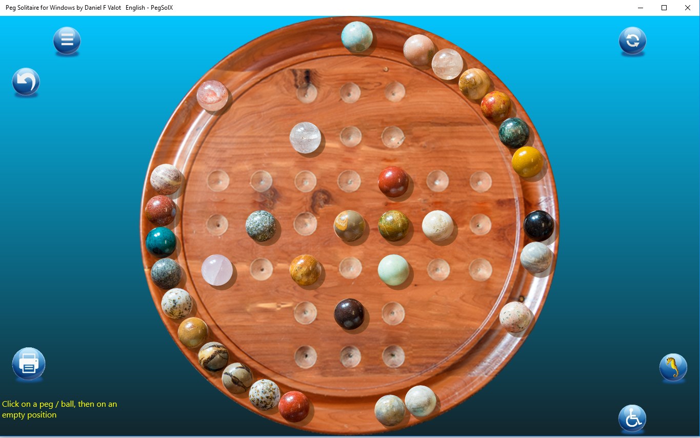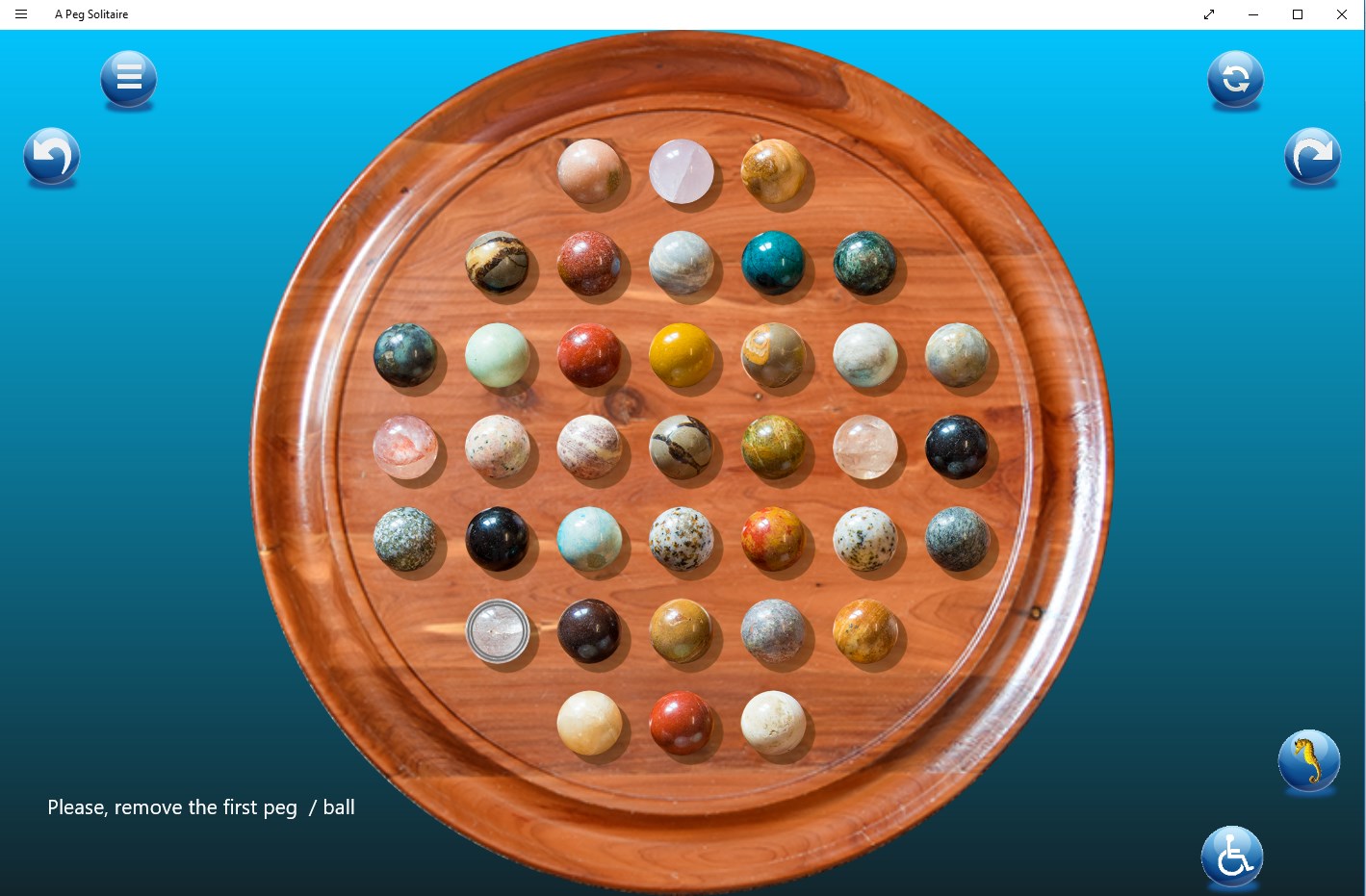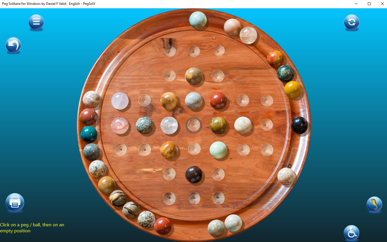 This is the classic Peg Solitaire Game with undo / redo facilities. support for eleven languages (German (Germany),English (United States),Arabic (Saudi Arabia),Bangla (Bangladesh),Chinese (China),Spanish (Spain),French France),Hindi (India),Hungarian (Hungary),Italian (Italy),Japanese (Japan),Malay,Dutch (Netherlands),Norwegian (bokmål) (Norway),Portuguese (Portugal),Russian (Russia),Swedish (Sweden))