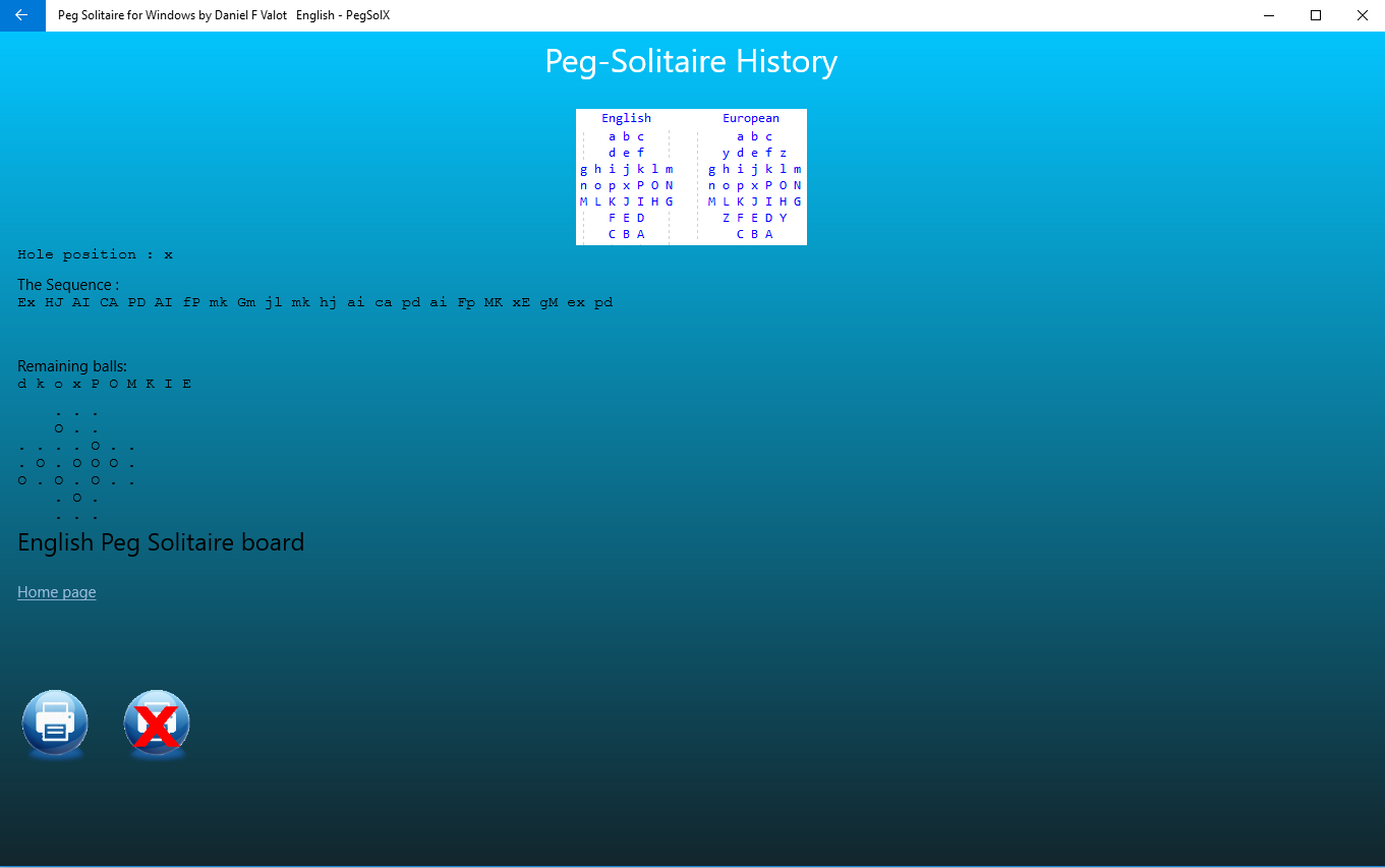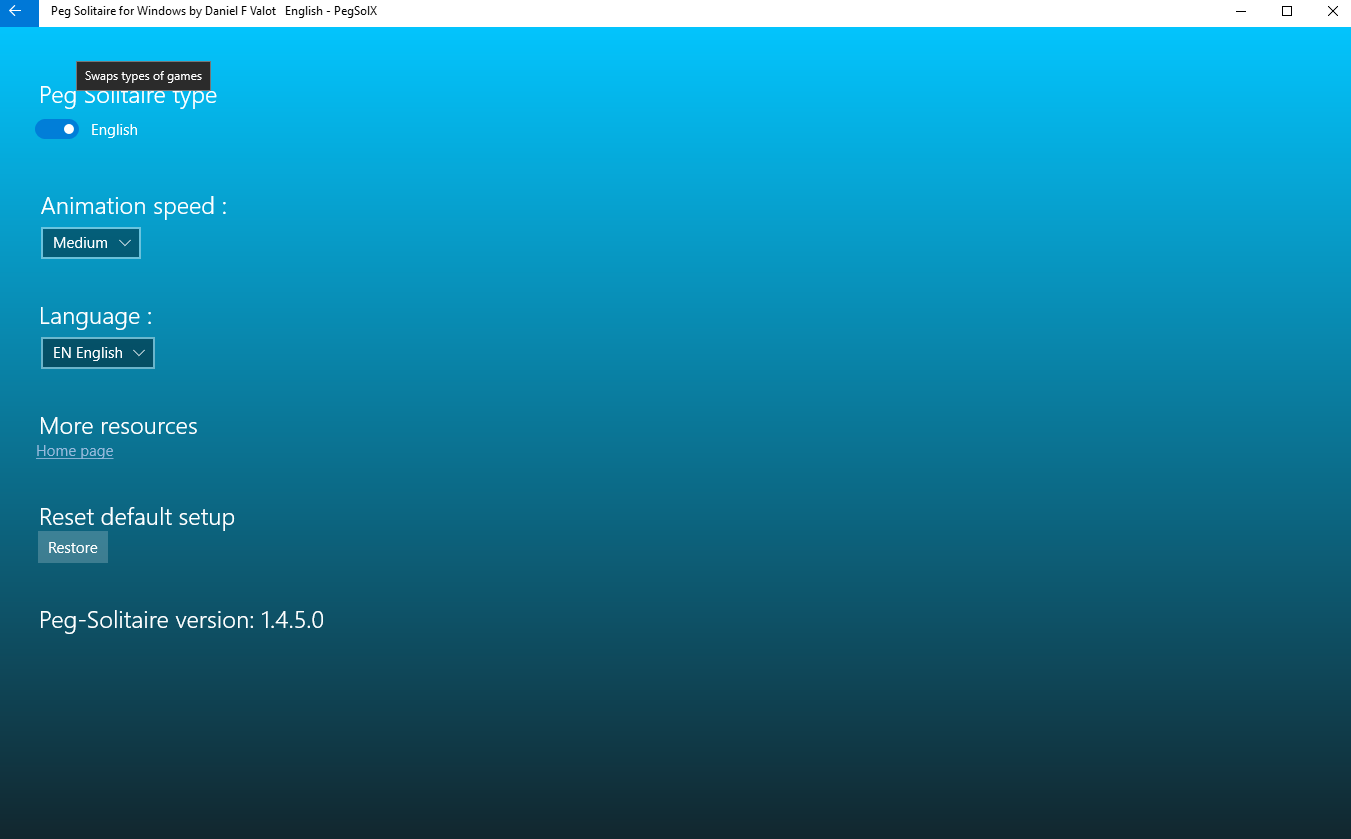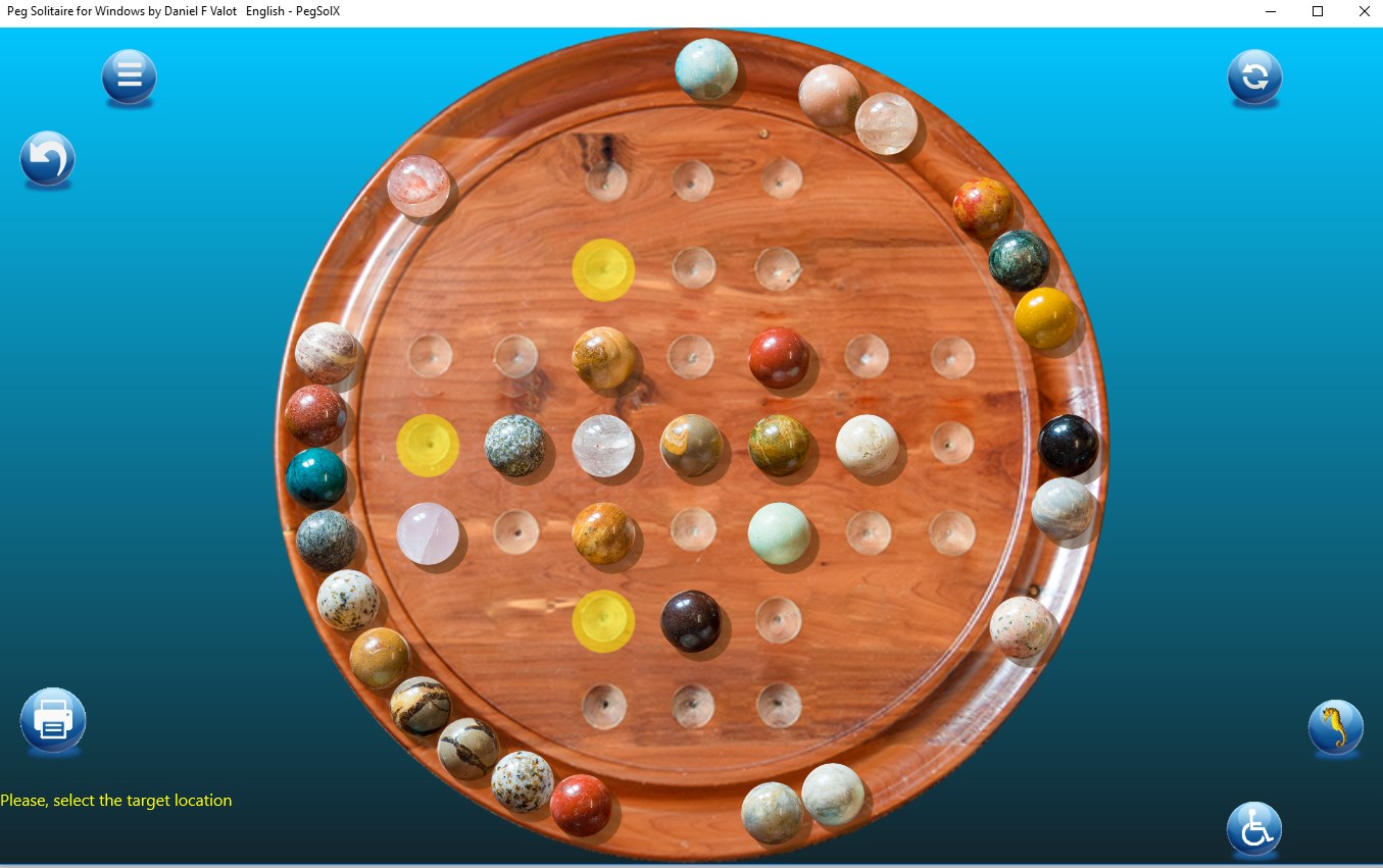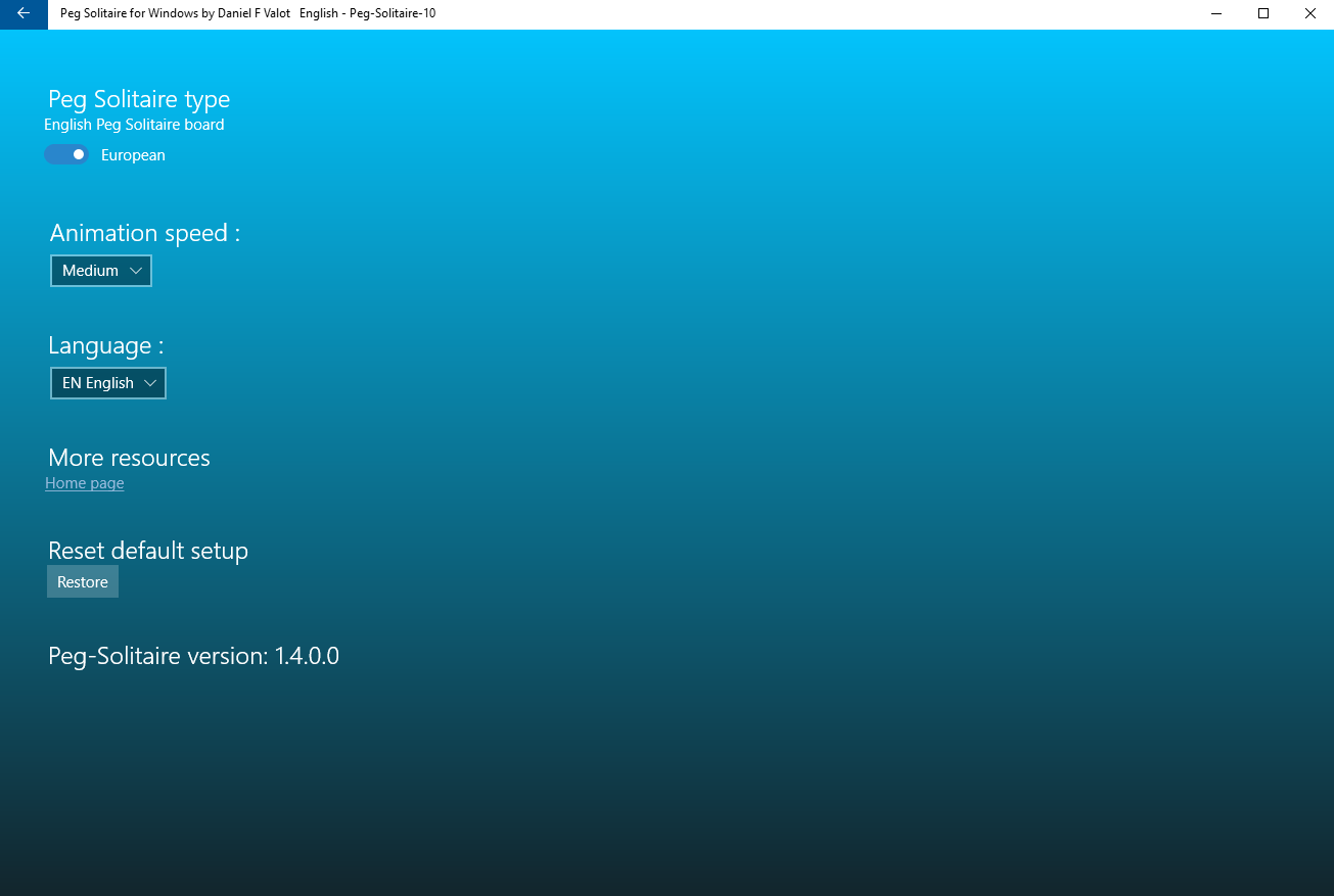This is the classic Peg Solitaire Game with undo / redo facilities. support for eleven languages (German (Germany),English (United States),Arabic (Saudi Arabia),Bangla (Bangladesh),Chinese (China),Spanish (Spain),French France),Hindi (India),Hungarian (Hungary),Italian (Italy),Japanese (Japan),Malay,Dutch (Netherlands),Norwegian (bokmål) (Norway),Portuguese (Portugal),Russian (Russia),Swedish (Sweden))