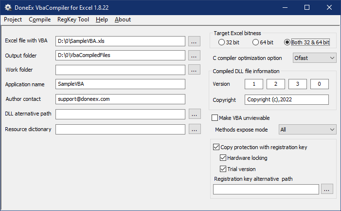 Compilation of VBA code of excel files (xls, xlsm, xlsb, xla, xlam) into binary code (DLL file)Speed up VBA. The performance of some VBA algorithms increases significantly after compilation.Automatic code generation to connect compiled functions from DLL to VBA projectAutomatic VBA code protection from copying, tracing – by compiling VBA code into binaryAbility to compile VBA code into a Windows DLL for either 32-bit or 64-bit ExcelSetting of compiled DLL file version number and copyrightCompilation from command lineCompiled VBA code copy protection and licensing with registration/activation keyCreate Trial/Demo version of workbook or Excel Add-InTranslate or customize run-time messages