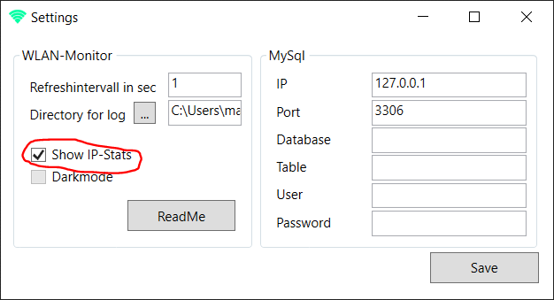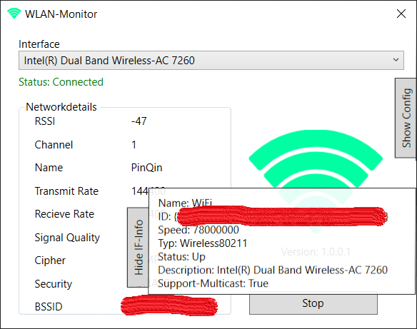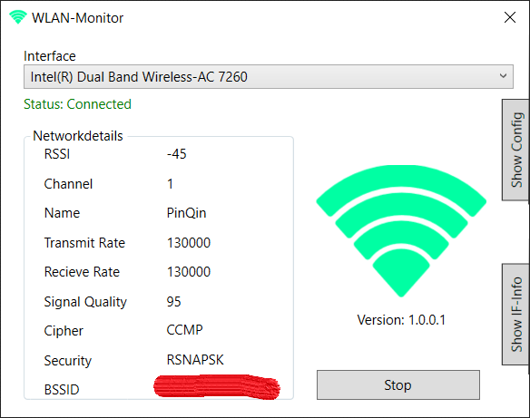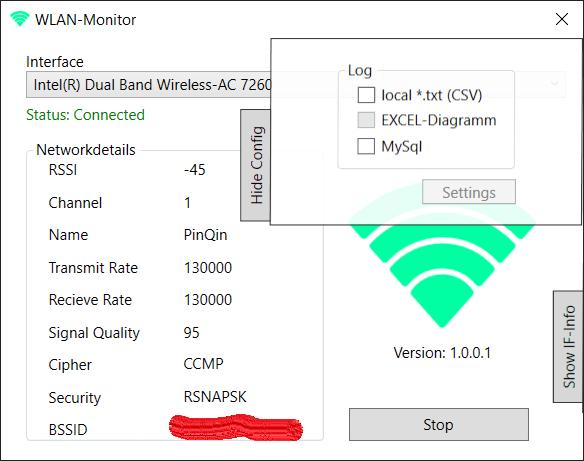 WLAN Monitor is a small network tool. It makes it possible to scan the connected WIFI and log various data. Logging can be done in different formats. As a text file (csv), Excel with diagrams (quality - time and signal strength - time) or in a MySql database.