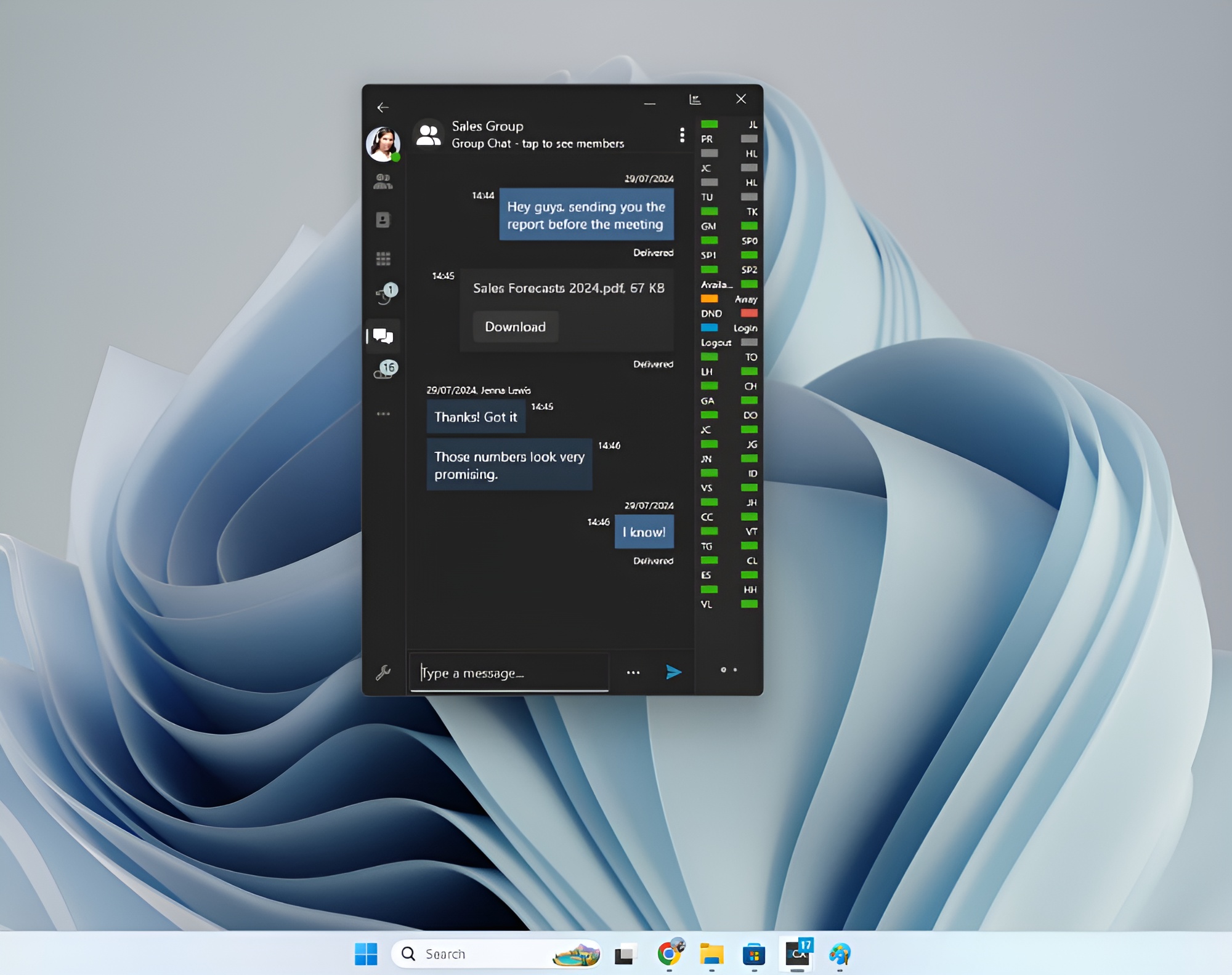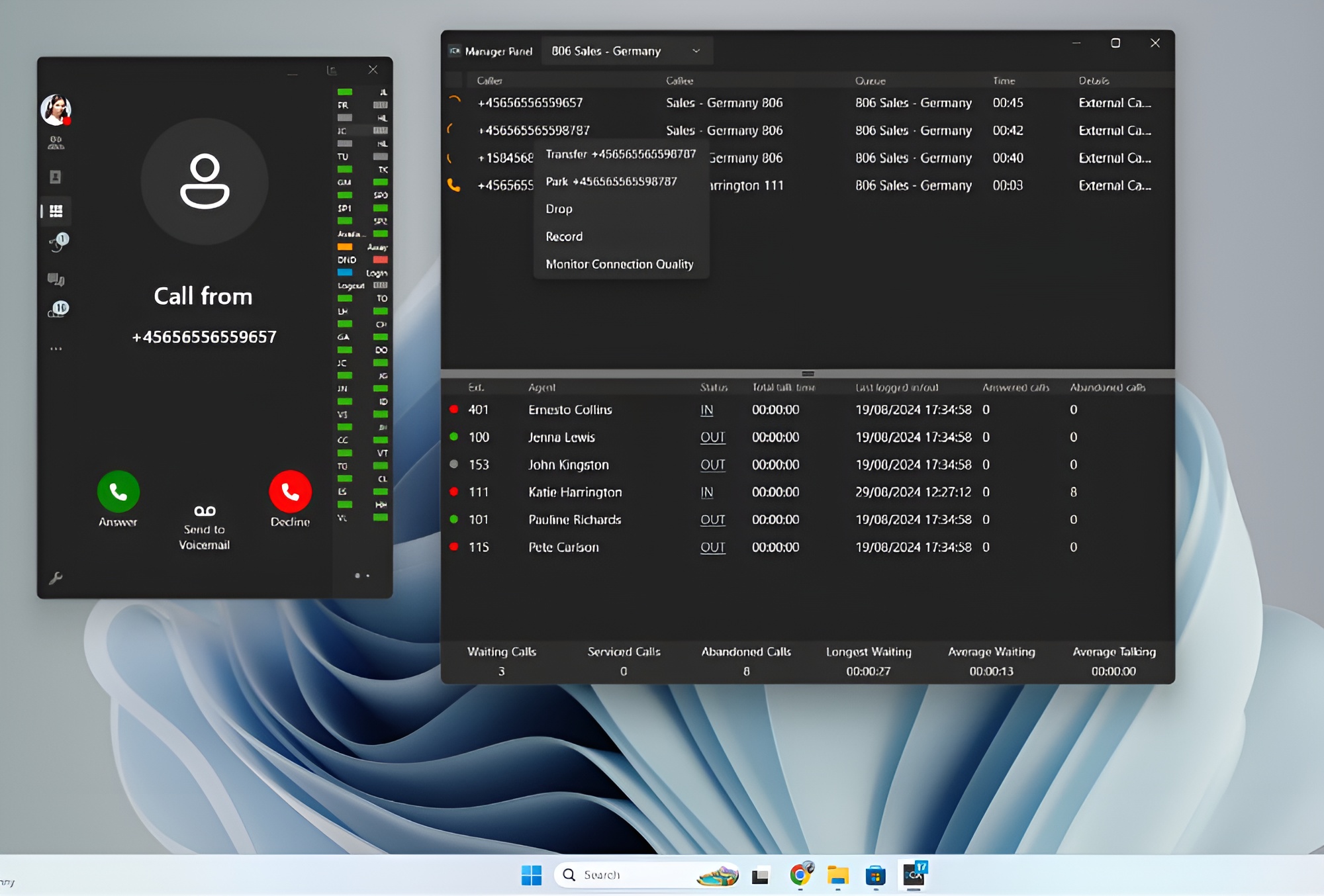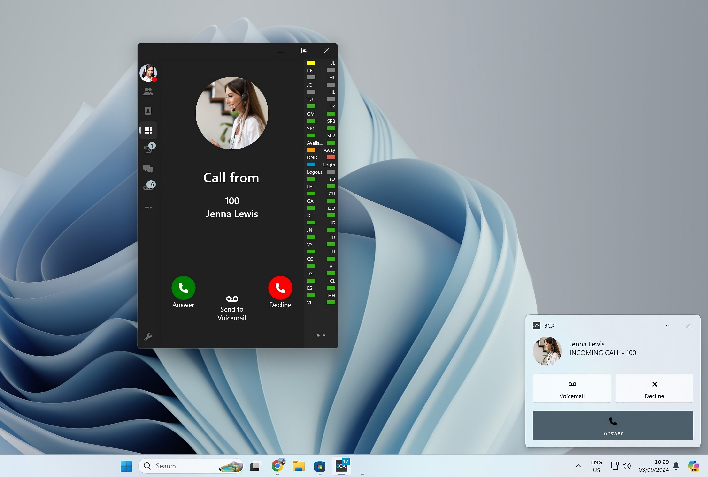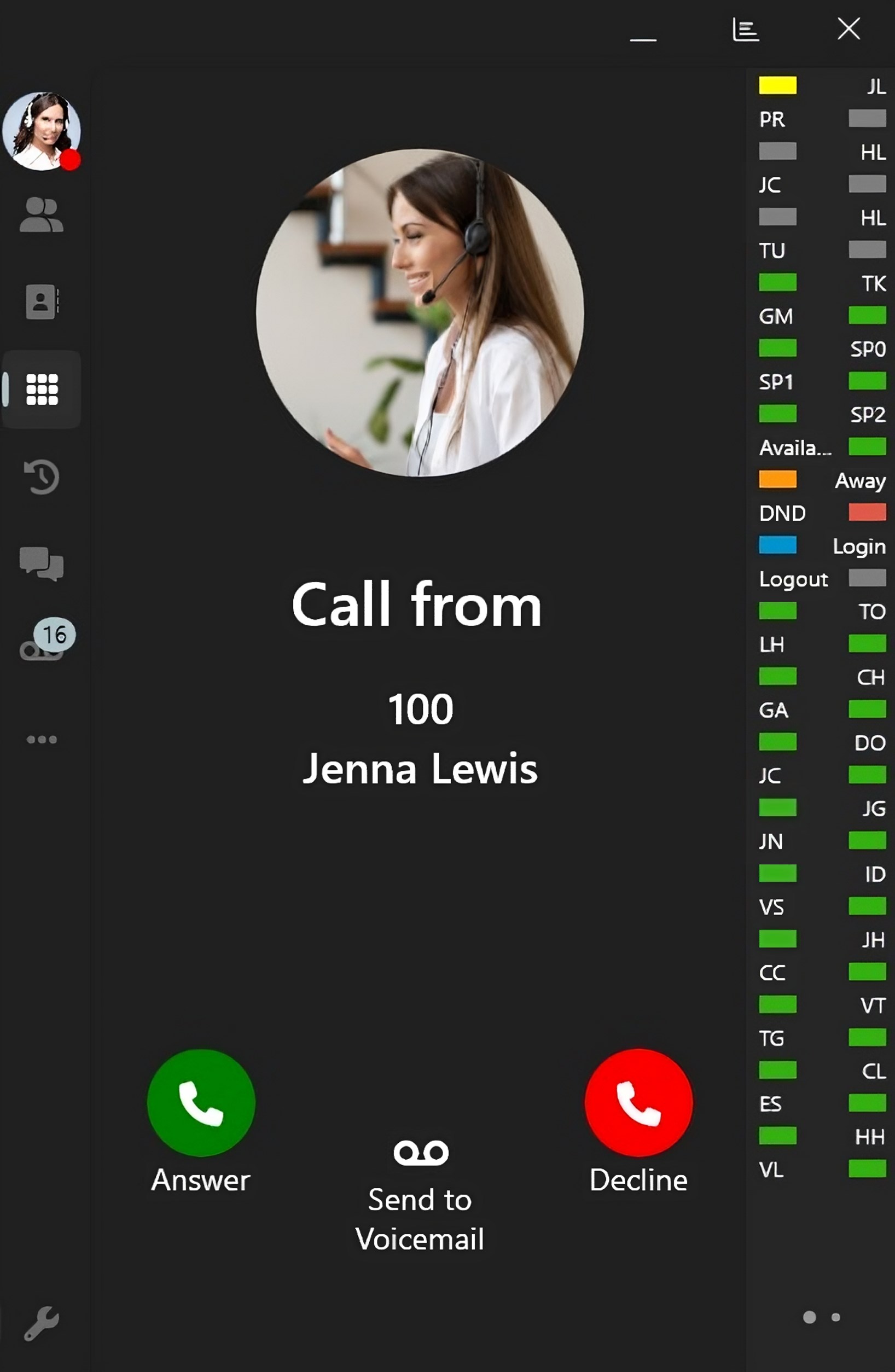 The 3CX Softphone notifies users in real-time of incoming calls and enables easy call management from their desktop. Users can set their status, view CRM & phonebook entries as well as access their BLF panel for fast calling.