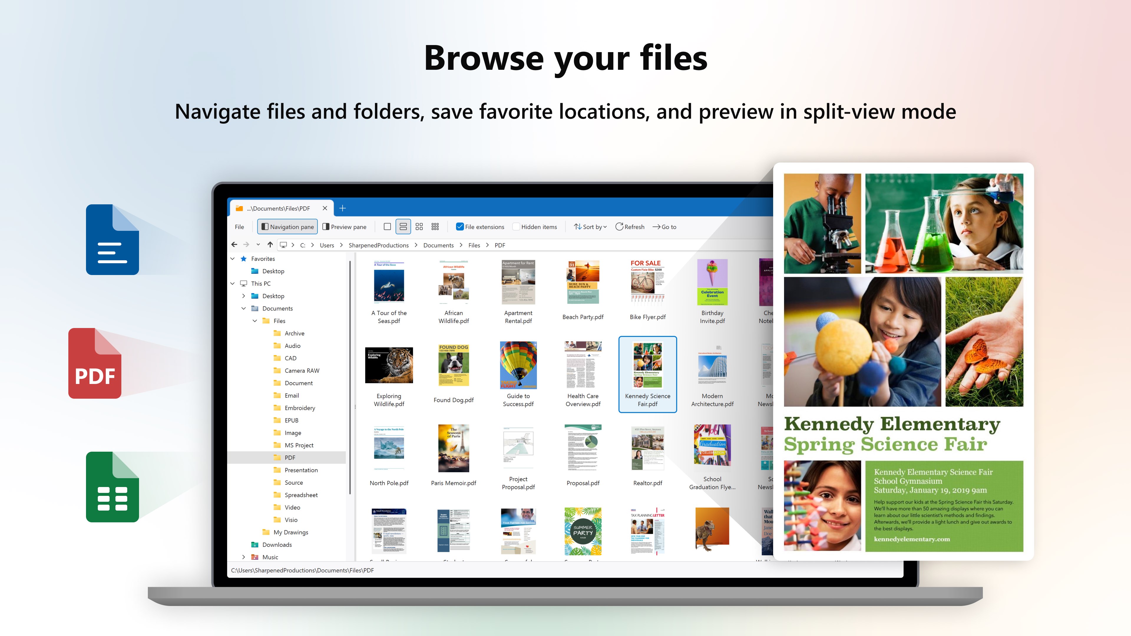 View over 400 file formats with a single appOpen, edit, and save Microsoft Office documentsOpen several other document, spreadsheet, and presentation formatsCreate new word processing documents and spreadsheetsPlay audio and video filesOpen over 100 image formats, including camera raw filesOpen 2D and 3D CAD filesDecompress file archivesBrowse files on your system and view thumbnails and previewsBatch convert hundreds or even thousands of files at onceInspect file contents and view file properties and metadataIdentify unknown files, even ones without file extensions