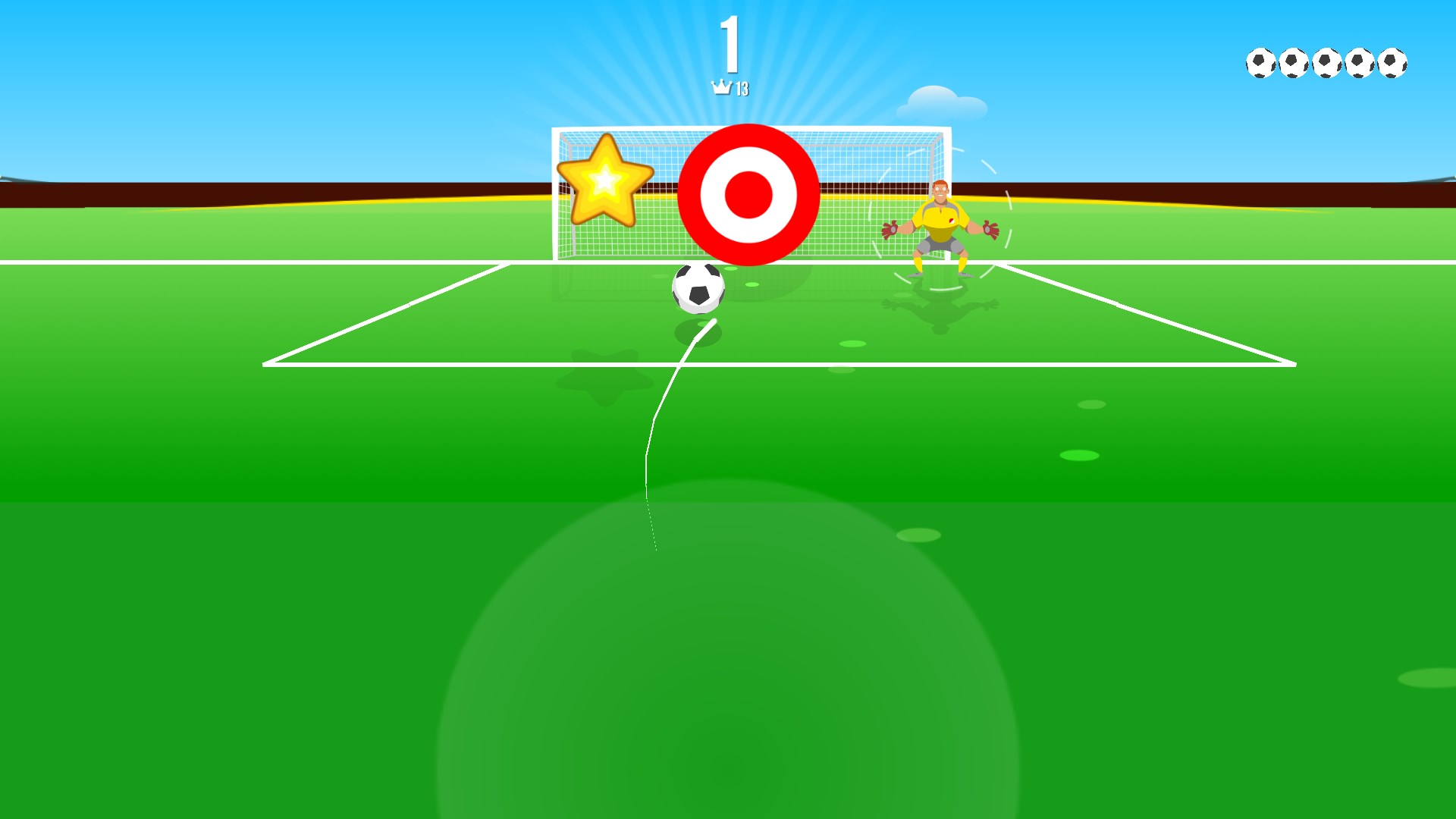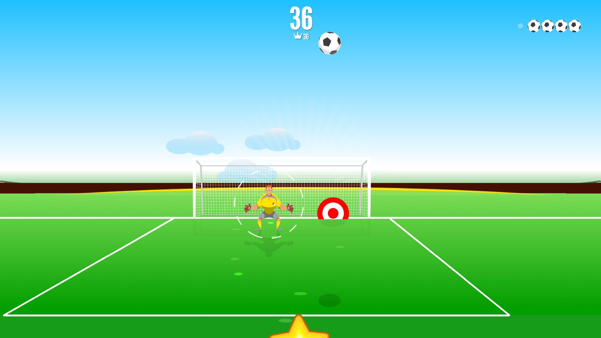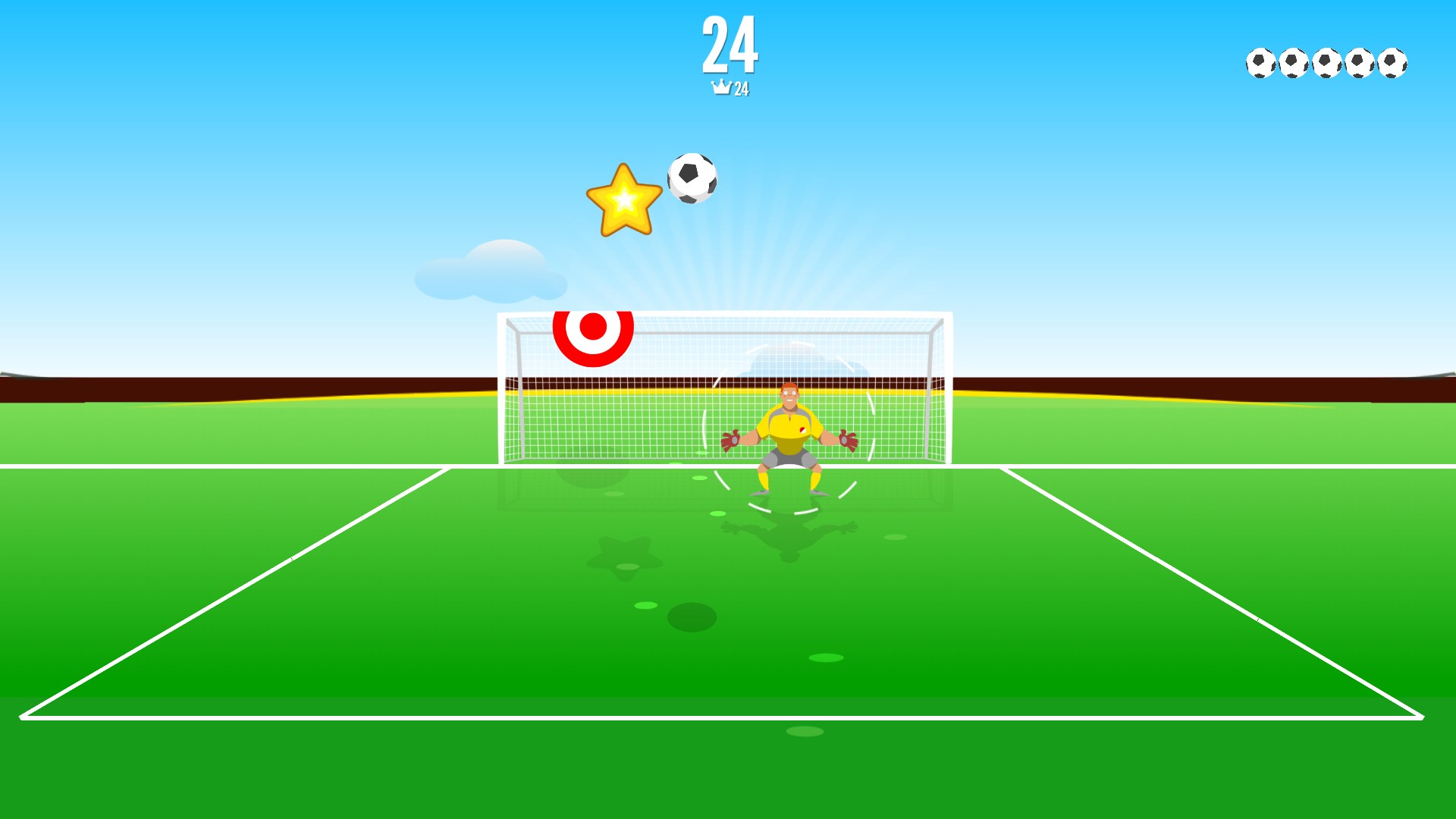 Shoot wisely, since the goalie and the defenders will try to stop it. Aim your shot and give some effect to the ball, and try to get all the stars as you score the goal! Funny and addictive penalty shootout game with no time limit and for all the family, so kids and adults will have fun. How many goals in a row can you get?