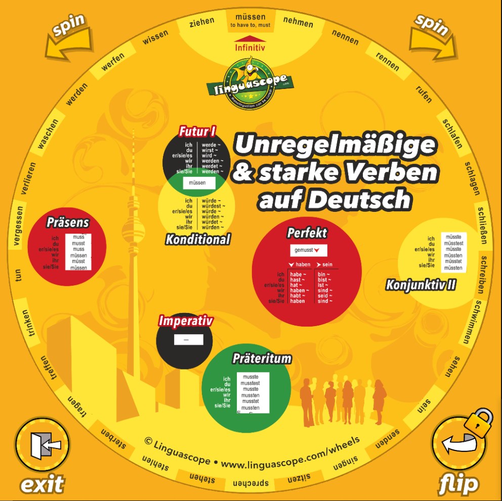 Each verb wheel (French, Spanish, German, Italian, and English) is a double-sided learning and reference aid giving details of 60 frequently used verbs with an irregular conjugation (120 in English). Both sides of the disc also include simple grammatical charts describing the conjugation of auxiliary verbs, composite verb forms and personal pronouns. An indispensable tool for anyone studying languages!