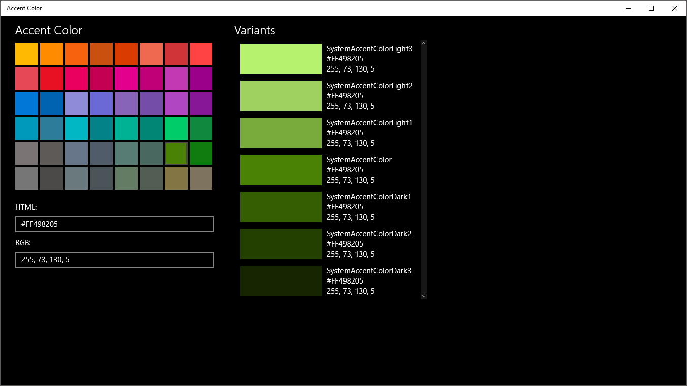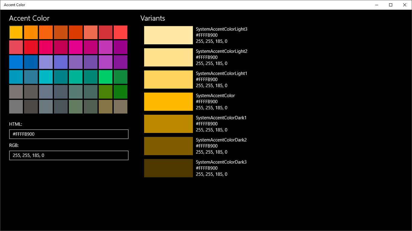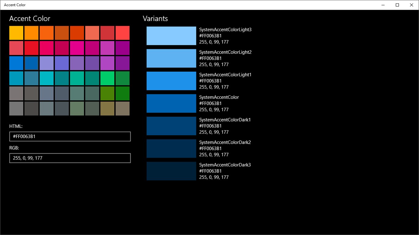 Displays the color variants of a selected accent color. The color variant’s information includes the resource name (for use in XAML), HTML hex string, and RGB color code. This app allows quickly previewing accent color variants without having to alter the Windows accent color setting (Windows > Settings > Personalization > Colors).