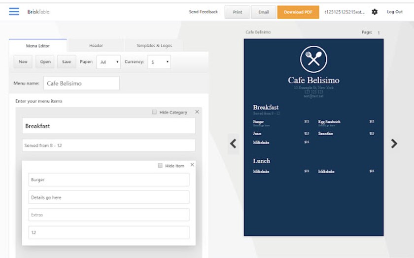 Craft the perfect menu using our intuitive interfaceChoose from one of our 20+ professional templates or start from scratchCustomize your fonts, sizes and marginsUpload your own logo to highlight your brandPrint in all popular paper sizesAdd descriptions, notes and optional extrasSpecify vegetarian, vegan and gluten-free optionsCustomize menus for dine-in, takeout and deliveryPerfect for wine lists, daily specials, drink menus, seasonal menus and moreOpen existing menus to make changes and adjust your pricing on the flySave as a PDF to share onlineNo design experience necessary