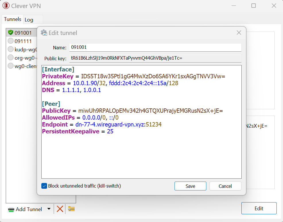 Clever VPN is a fast, modern, and secure VPN tunnel. It supports port roaming. This app allows users to manage and use VPN tunnels. The app can import new tunnels from archives and files, from QR codes, or you can create one from scratch.