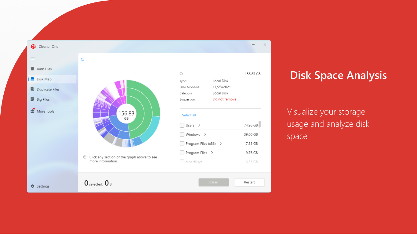 • View a color-coded breakdown of every folder on your disk, with detailed information at one click