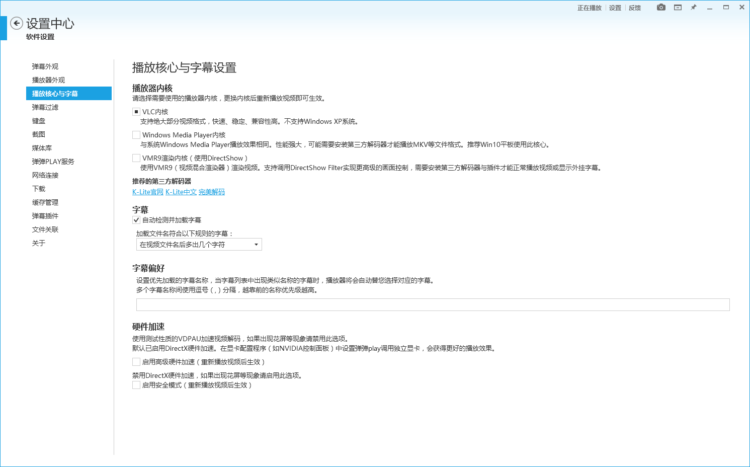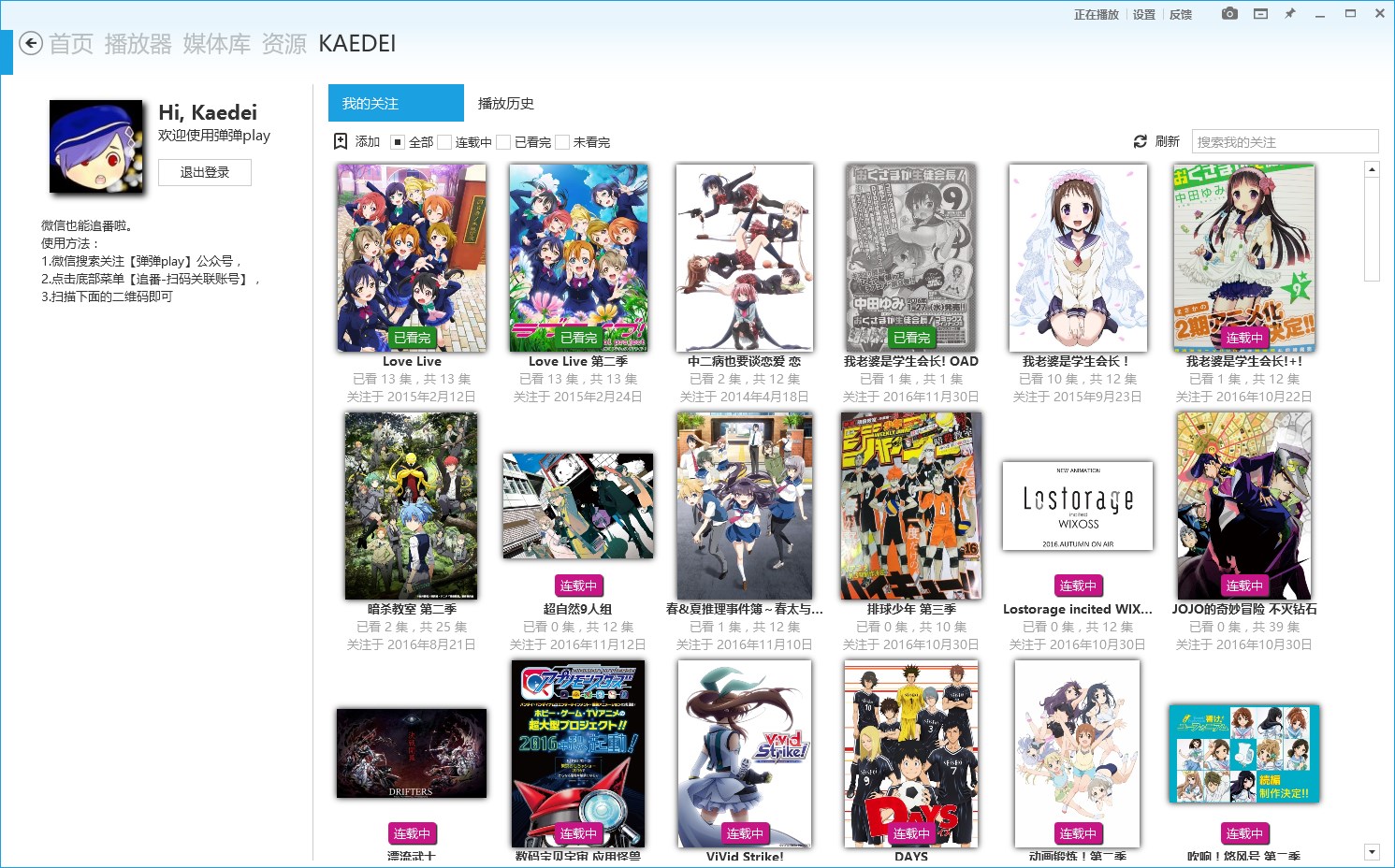 支持绝大部分流行视频格式视频内容自动识别并加载其他用户的弹幕评论使用媒体库功能将硬盘上的视频文件统一管理在视频的任何时间点发送弹幕评论支持BitTorrent和magnet下载,完善的下载任务管理系统记录观看历史,关注任何你感兴趣的剧集,并在剧集更新时进行提示云屏蔽功能,自动过滤他人不友善的言论支持触摸屏手势操作更换自己喜欢的主题颜色与背景图片可以自动加载并查看来自多个第三方网站的评论弹幕搜索并加载网络上的字幕使用web界面浏览本机视频库通过DLNA协议将视频投屏播放到设备
