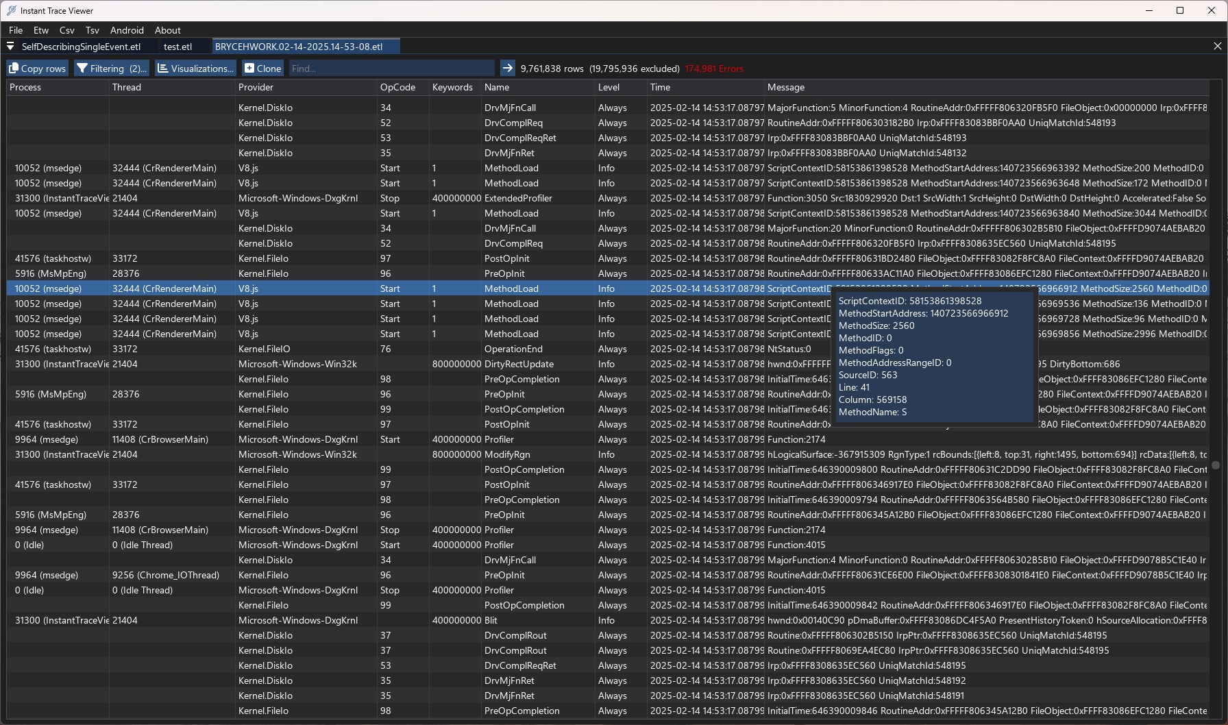 Instant Trace Viewer is a developer tool for collecting and viewing traces and logs. It provides an easy-to-use interface for viewing both real-time Event Tracing for Windows (ETW) and opening ETL files. The tool includes filtering options and graphical visualizations with the goal of making it effortless to see your program's trace logging as you develop software.