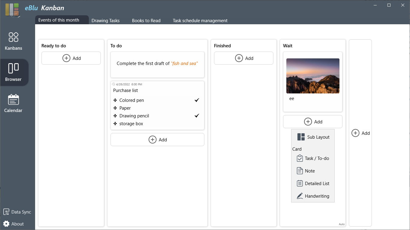 Support rich input card types. Blueberry Kanban doesn't just add simple note cards. Its rich input types make it easier to meet your needs for content editing. With blueberry Kanban, you can add cards of to-do, note, Ink handwrite, detailed list, and so on. Thus, you can easily realize various daily work or learning needs, such as task tracking, note management, handwritten drawing and notes.