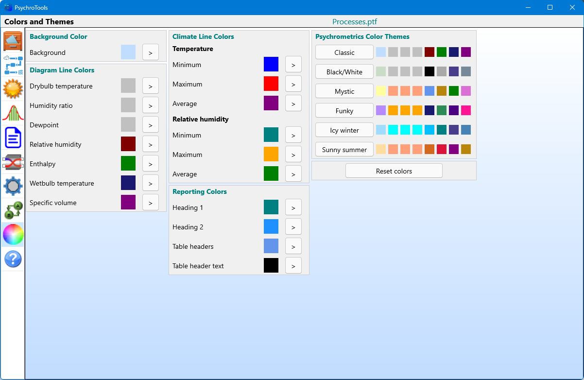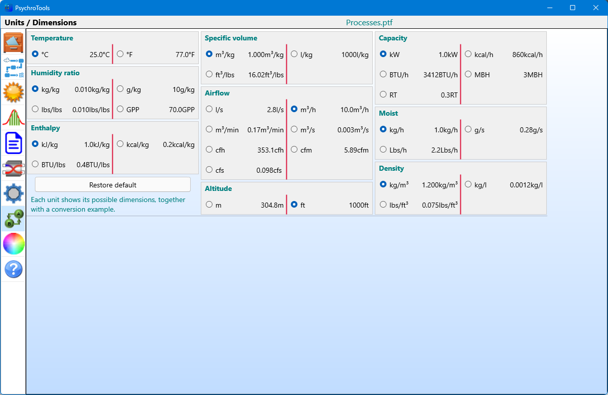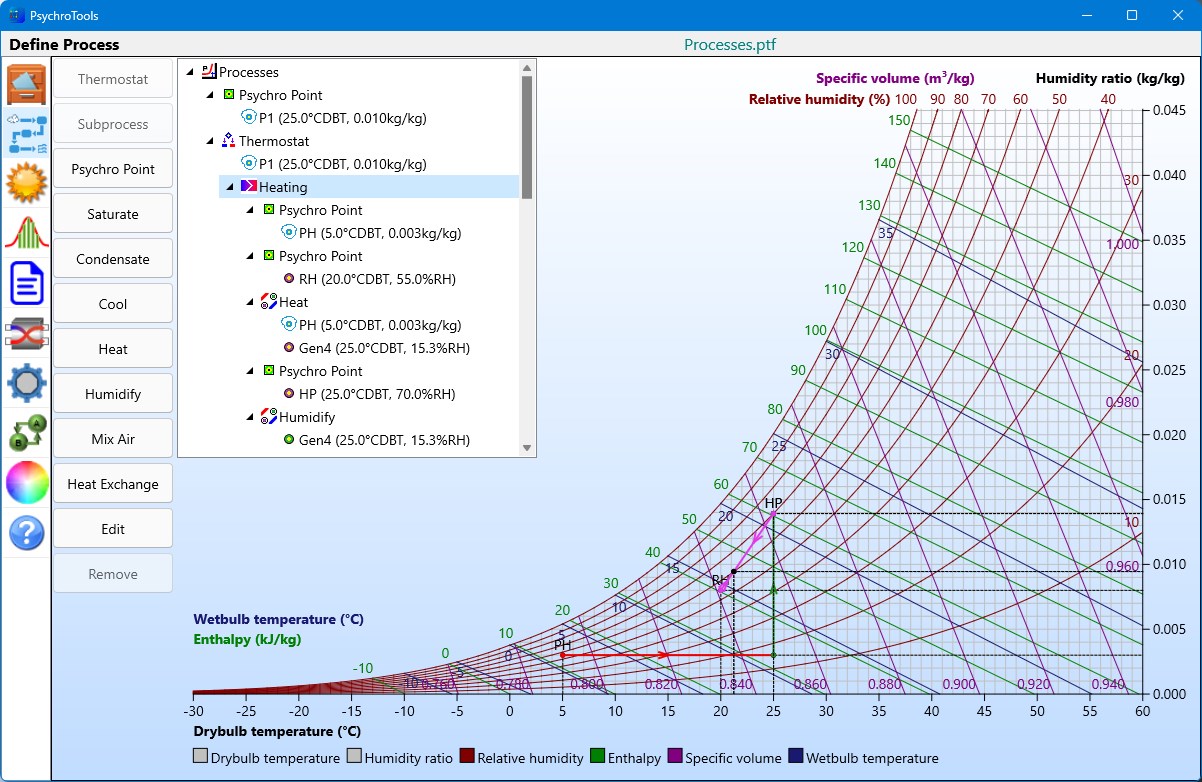 To define a psychrometric process, you have several actions at your disposal, which you can apply between two or more psychrometric points: