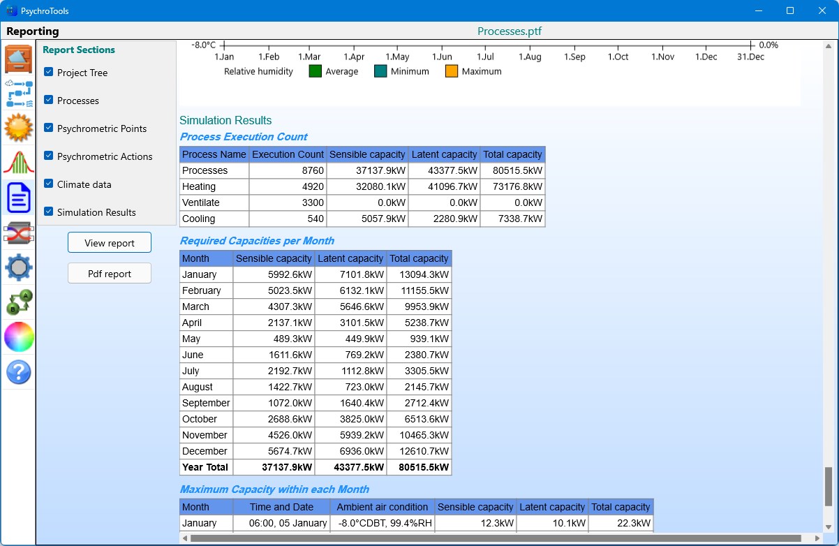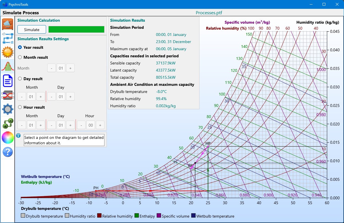 The app shows you the results in tables at different levels of details, but also on a dynamic psychrometric or Mollier diagram: click on any process point in the diagram to get all information about the air condition of that point. Look up a specific period (hour, day, month, year) and instantly get the required heating and cooling capacities within that period, but also the hour during which there was a maximum need of capacity.
