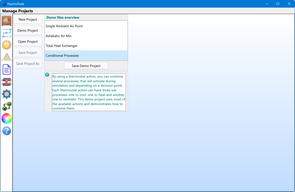 Use demo projects to start from and use them as a template for more complex projects.Find a manual on https://www.micriconsult.be/Manuals/PsychroTools_UsersManual.pdfClick the explain tab to get a short explanation of a calculation or a diagram.Select one of the five languages (English, French, German, Spanish and Dutch) in the preferences screen.Choose one of the diagram types (Psychrometrics or Mollier) and select the lines to display.Choose between metric or imperial unit dimensions, e.g. °C and °F or kW and BTU/h.Define parameters for heat exchangers.Select colors for the psychrometric diagram, the climate graphs and the report headers.Supports light and dark themes.The app saves your latest settings and starts up with those settings.