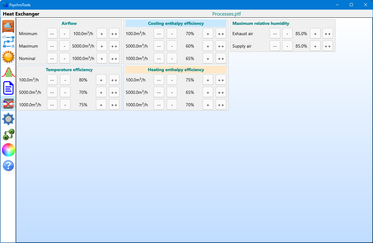 - Heat exchange: heat or cool ambient air using the exhausted room air. You can choose between a total heat exchanger and a sensible one. Even better, you can also define the characteristics of the heat exchanger.