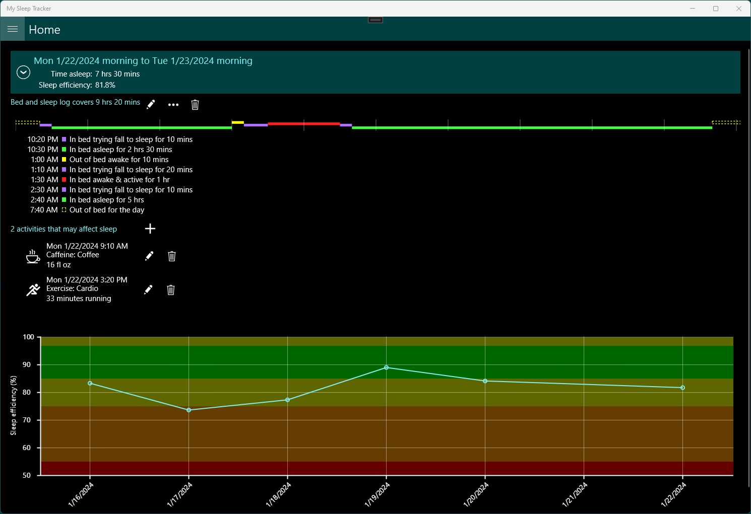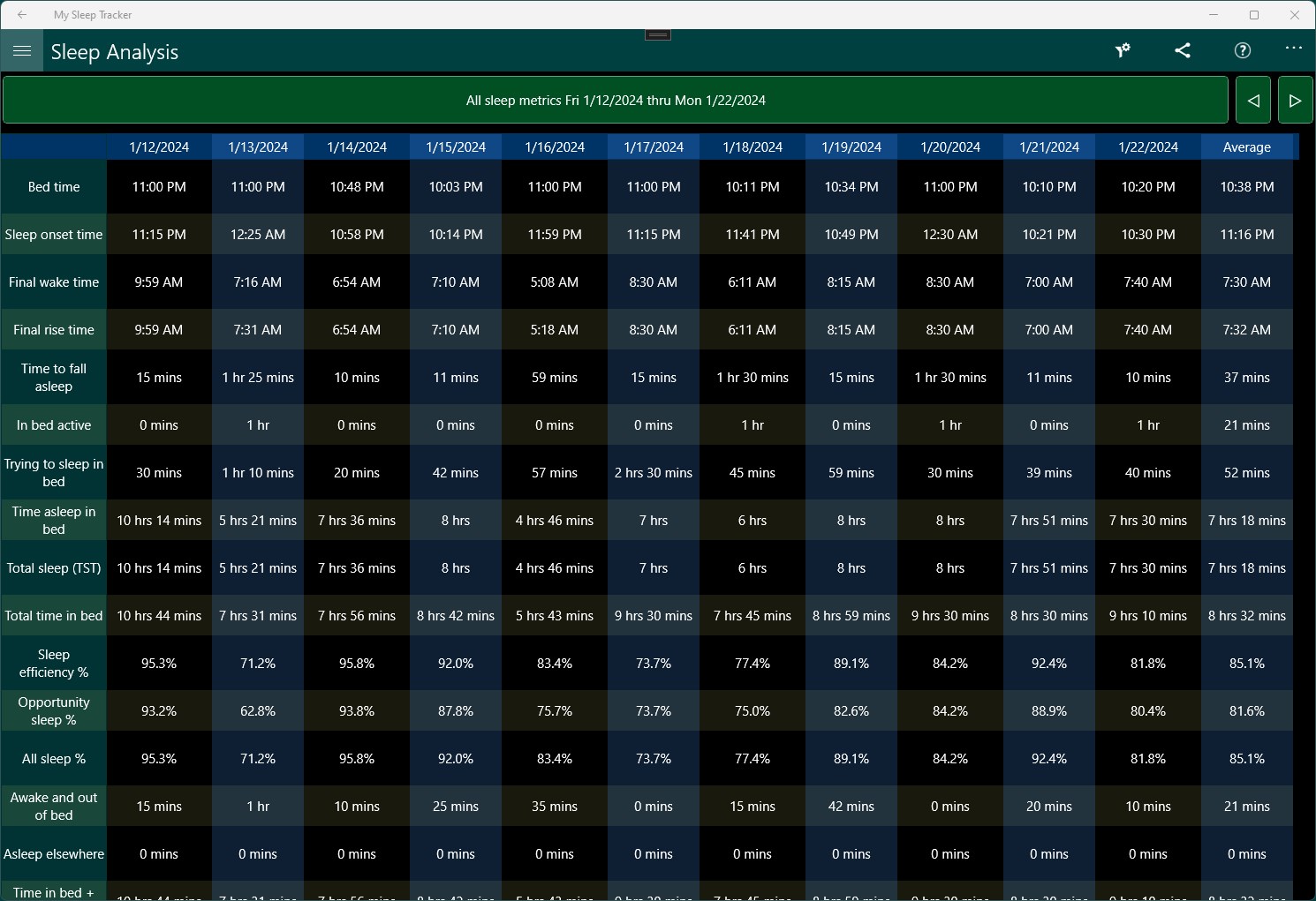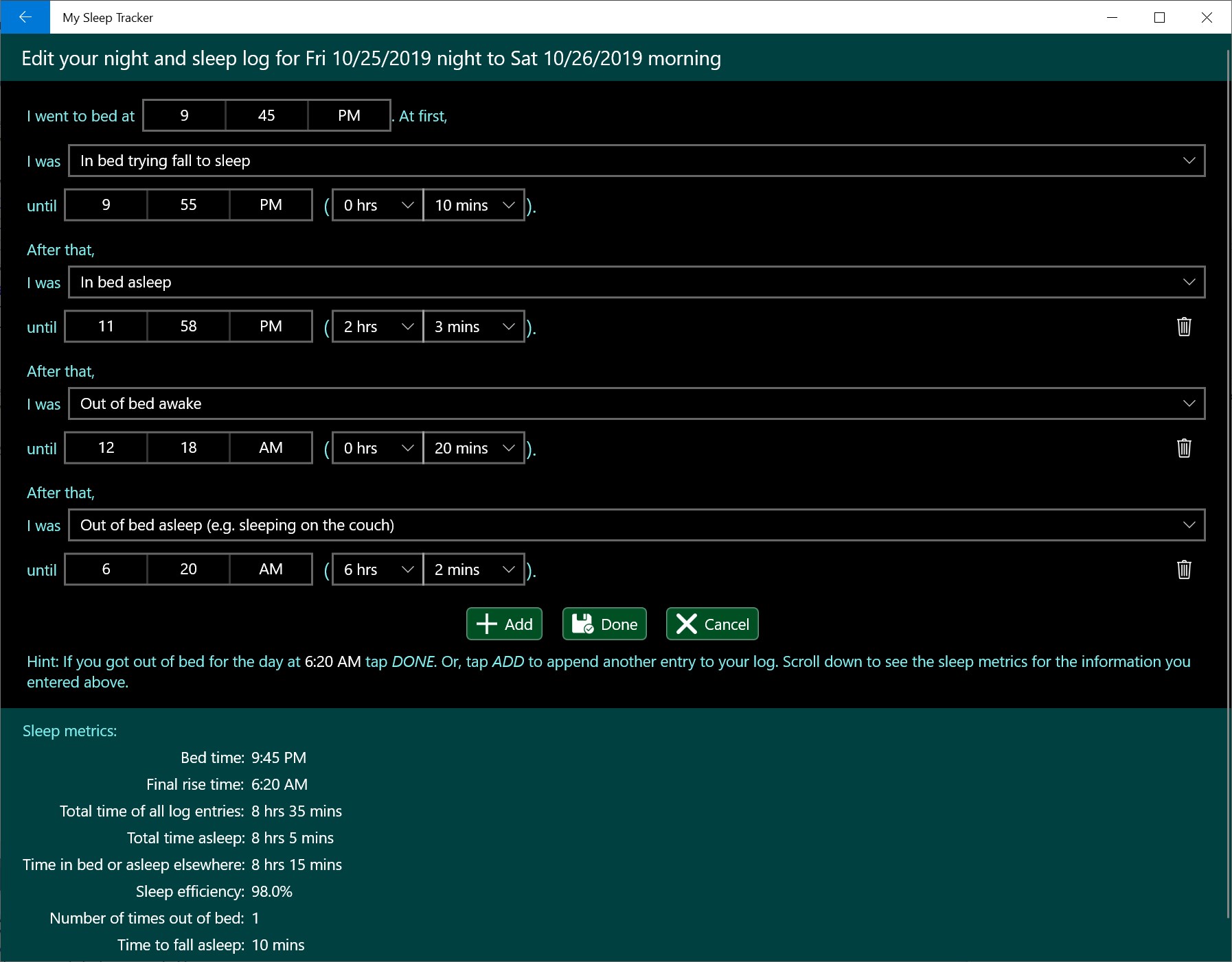 • The My Sleep Tracker app lets you log your sleep-related information and simplifies computing sleep summary data (metrics).