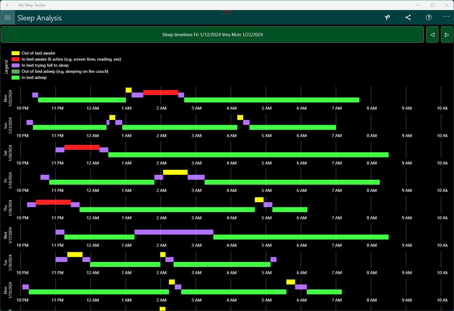 Track detailed bed and sleep information and activities that may effect sleep.Provides seven charts to help visualize what is going on with your sleep.Computes fifteen sleep metrics useful for CBTI (cognitive behavior therapy for insomnia).We will never send you junk email or show ads.This app does not provide medical recommendations about sleep. Please contact a licensed professional sleep therapist or doctor. They can review your sleep information and provide advice.The app developer respects your privacy. Only you can decide to share information. We will never harvest, sell, or share your information with any other third parties.An Internet connection is required to use this app -- so the online help/tips can be retrieved.