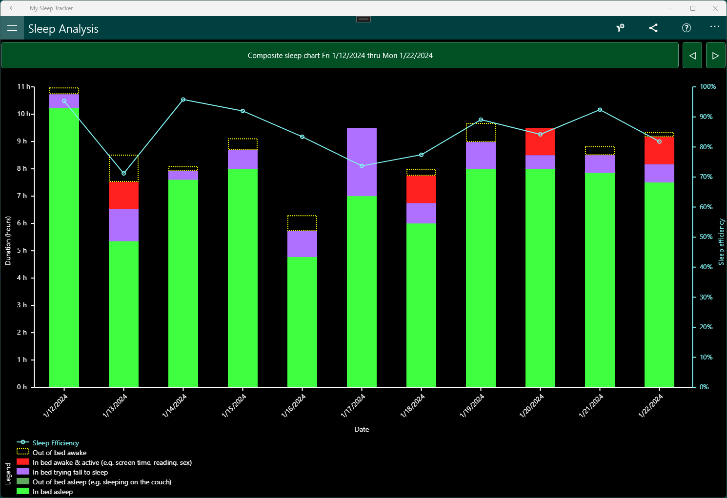 • Comprehensive: Accurately calculates Sleep Efficiency, Total Sleep Time, Time in Bed, Wake After Sleep Onset, and more. Many sleep tracking apps out there do not accurately calculate TIB or SE, because they don’t take into account time that clients get out of bed when using Stimulus Control. My Sleep Tracker takes clients’ behavior change into account and provides accurate, essential sleep metrics.