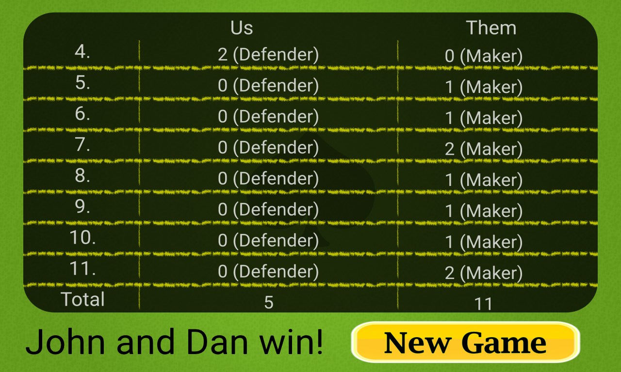 ✓ The player and his partner are called the makers if one of them chooses a trump suit. Otherwise they are called the defenders.