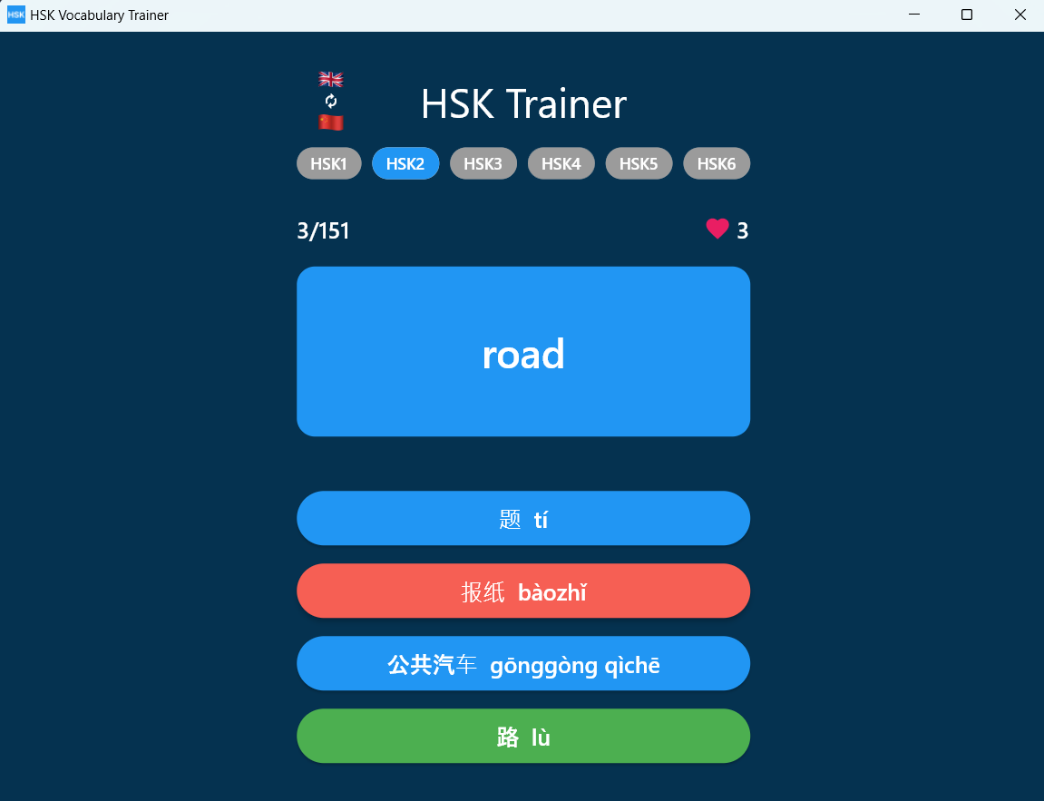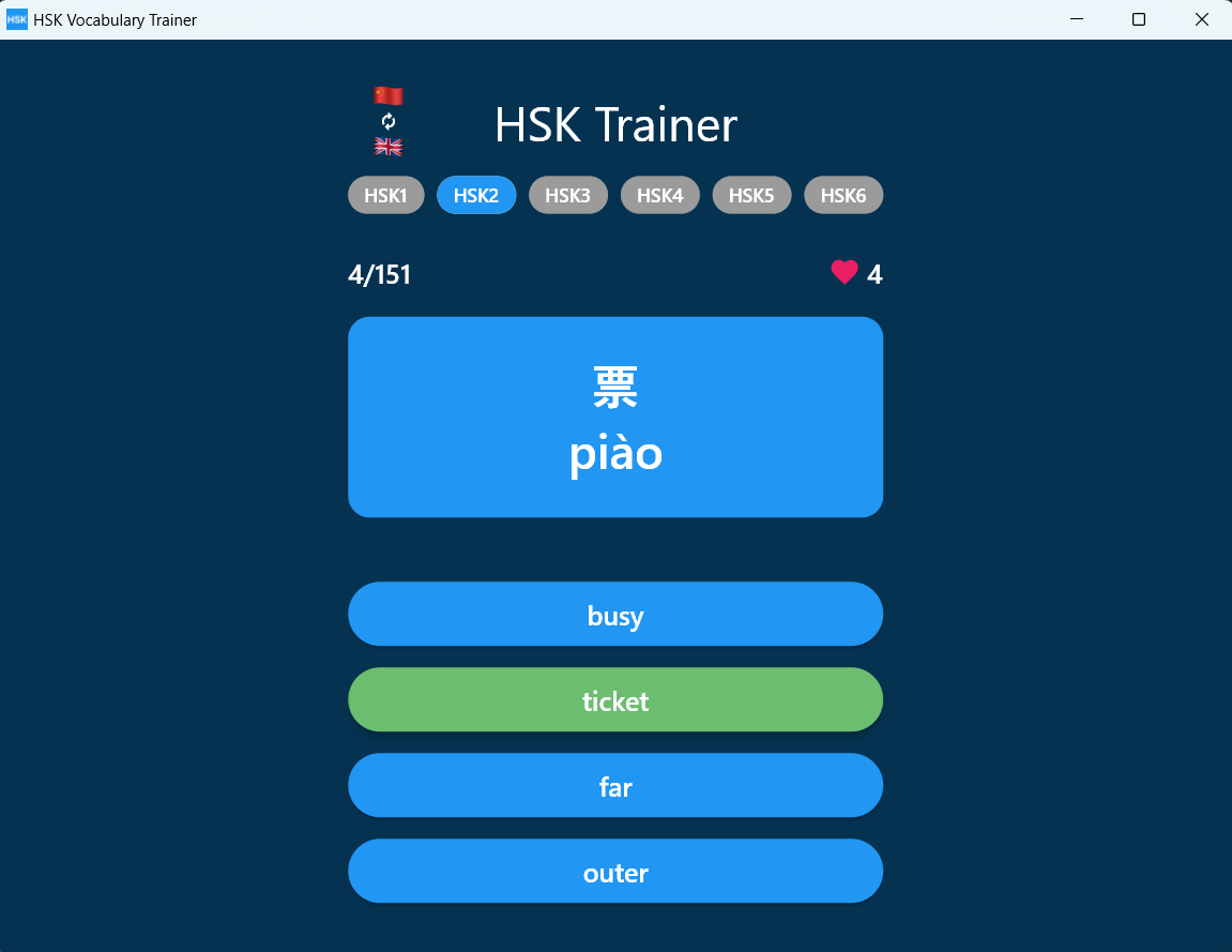 Select the HSK level you want to train forChoose one out of 4 possible translations.train english to chinese or chinese to english