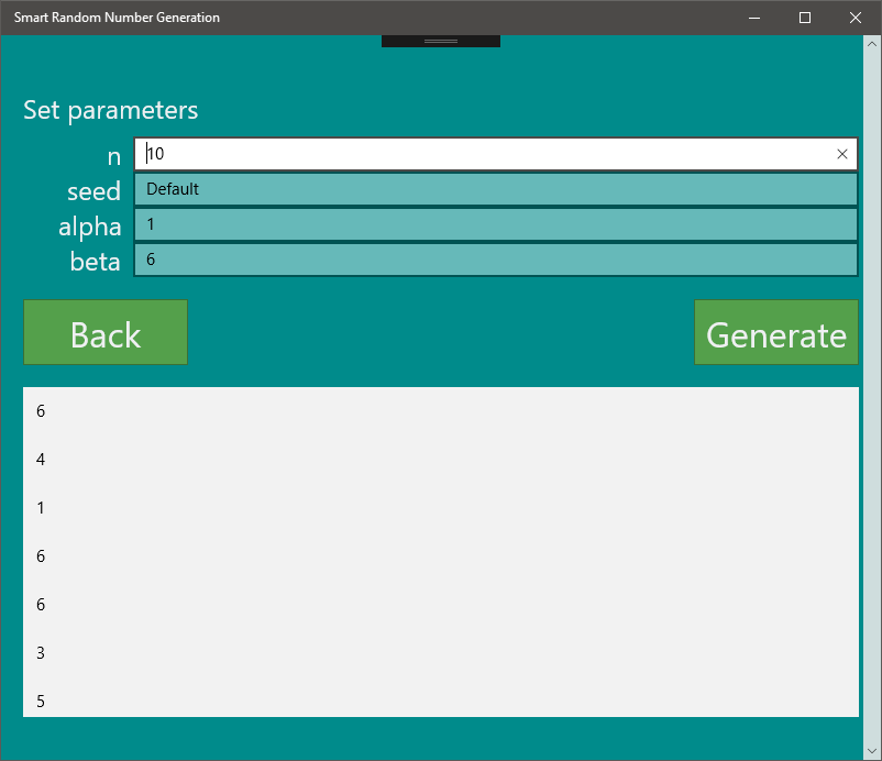 An application which generates random numbers based on a given generator and distribution.