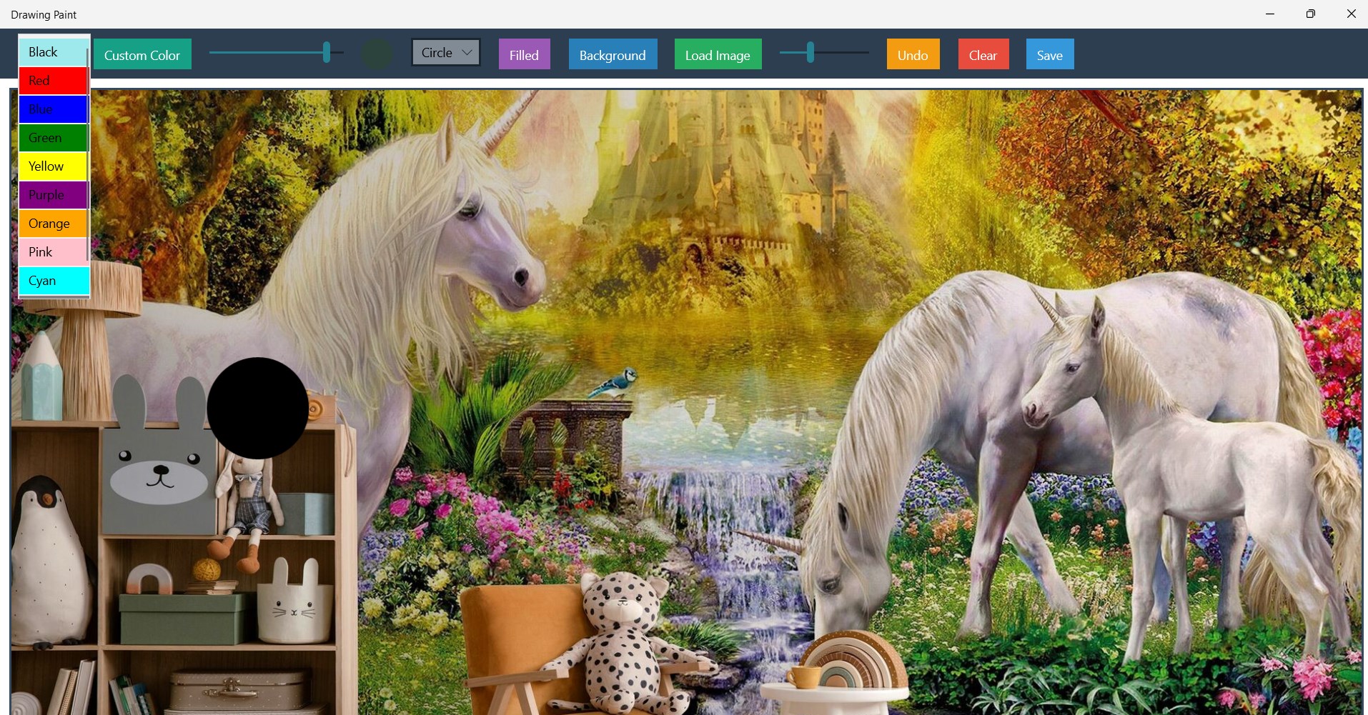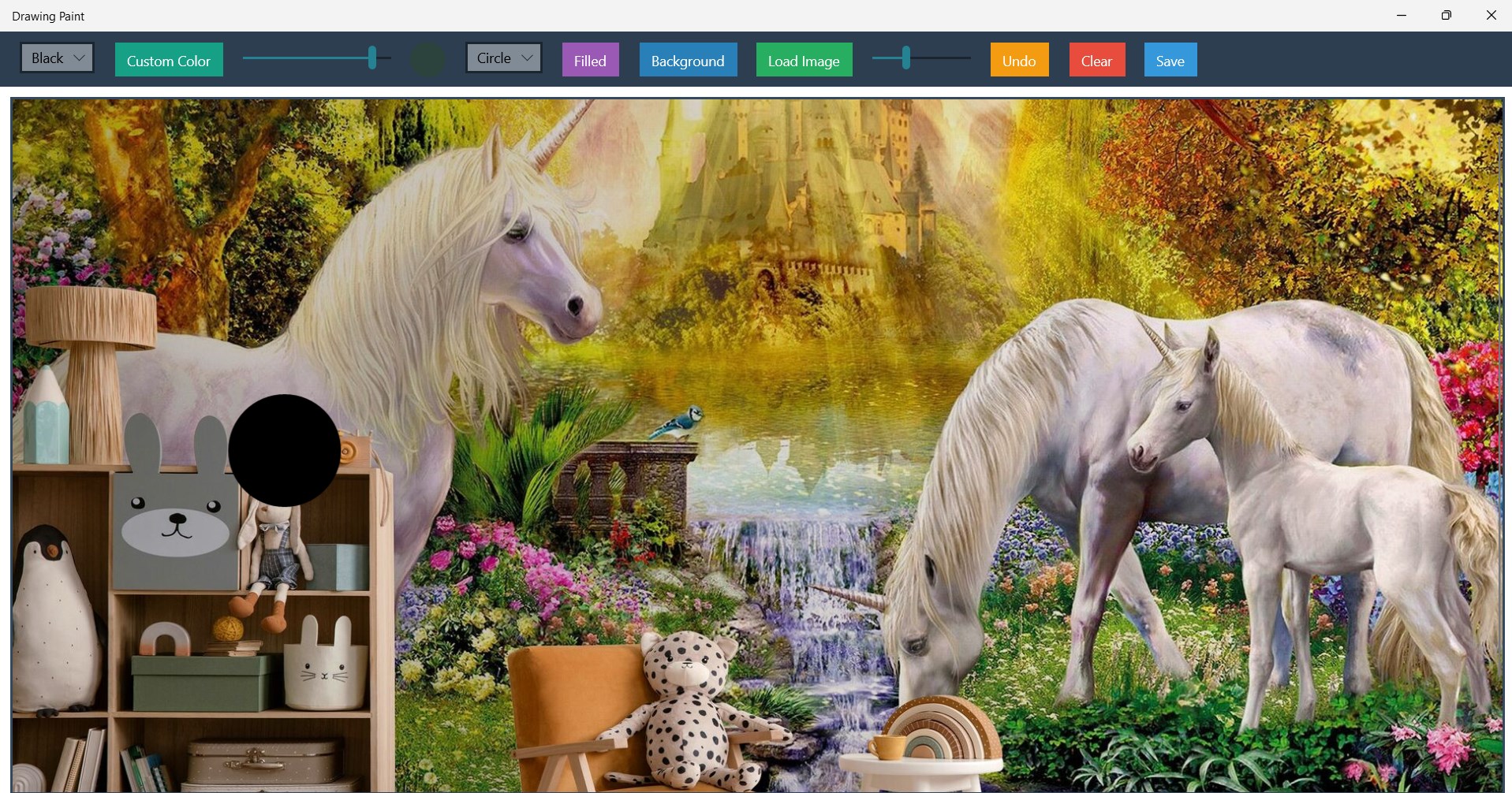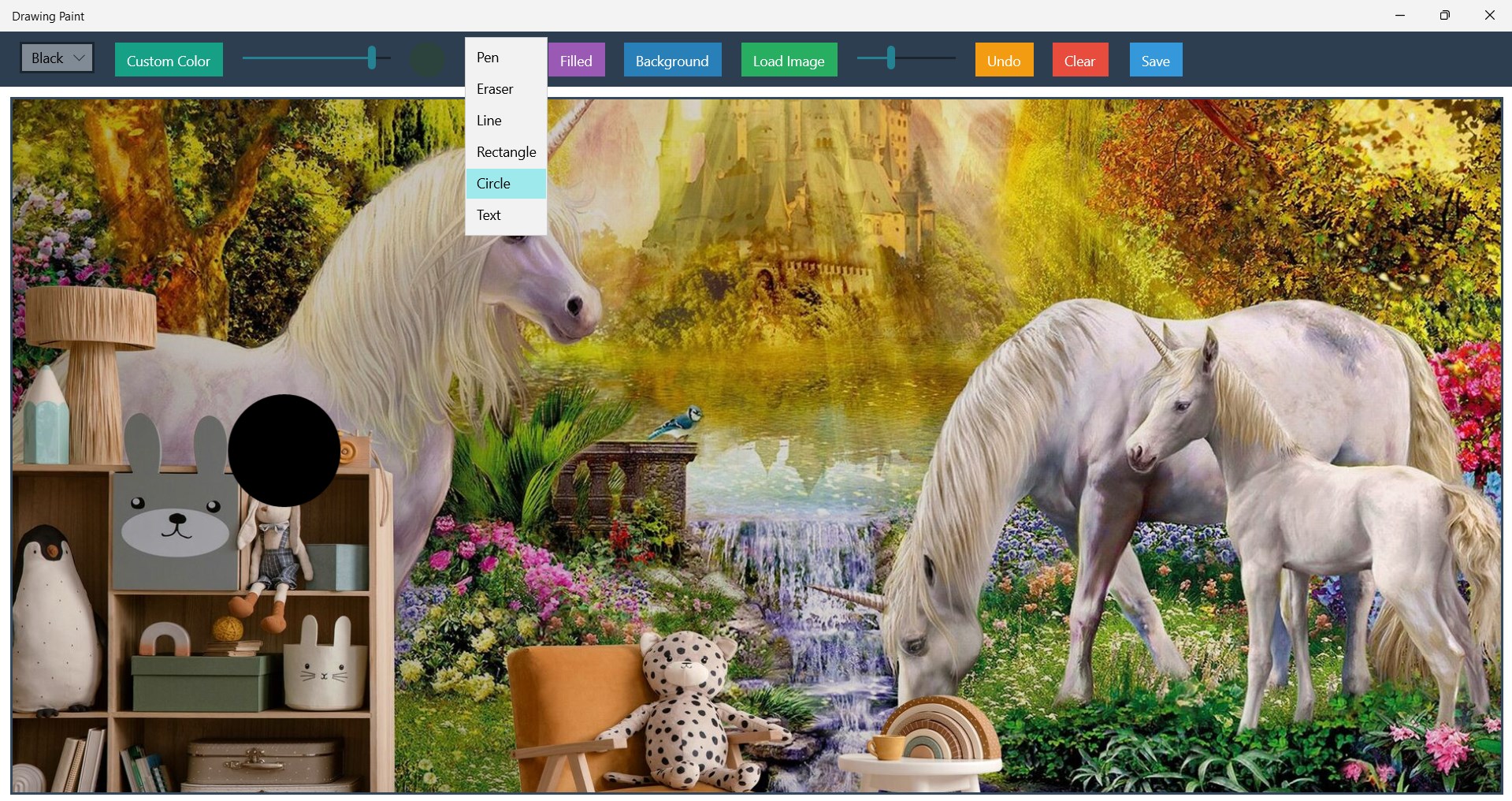 - Line, Rectangle, and Circle: Draw precise shapes with optional fill (toggled via a "Filled/Unfilled" button).