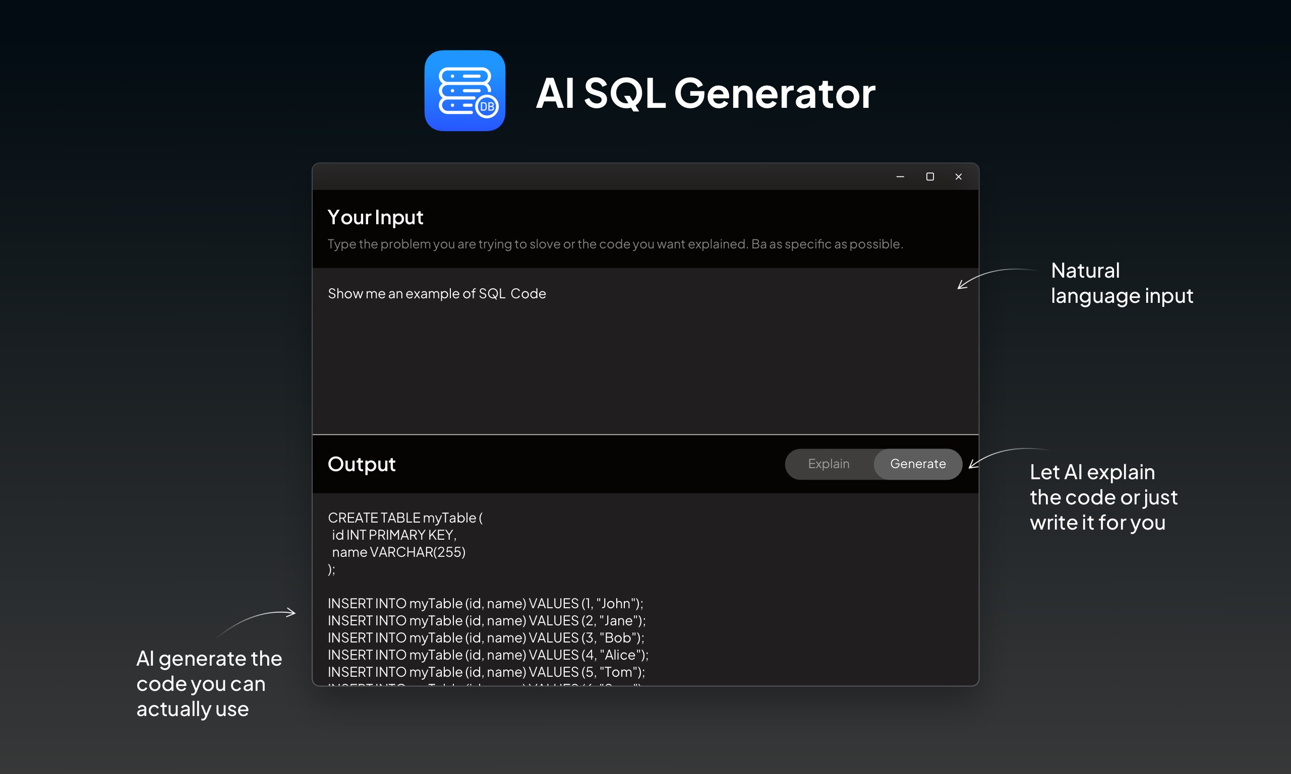 Whether you are working with large datasets or small databases, SQL Queries AI generator is the ideal tool to help you generate SQL queries quickly and accurately. Download the app today and start automating your database queries!