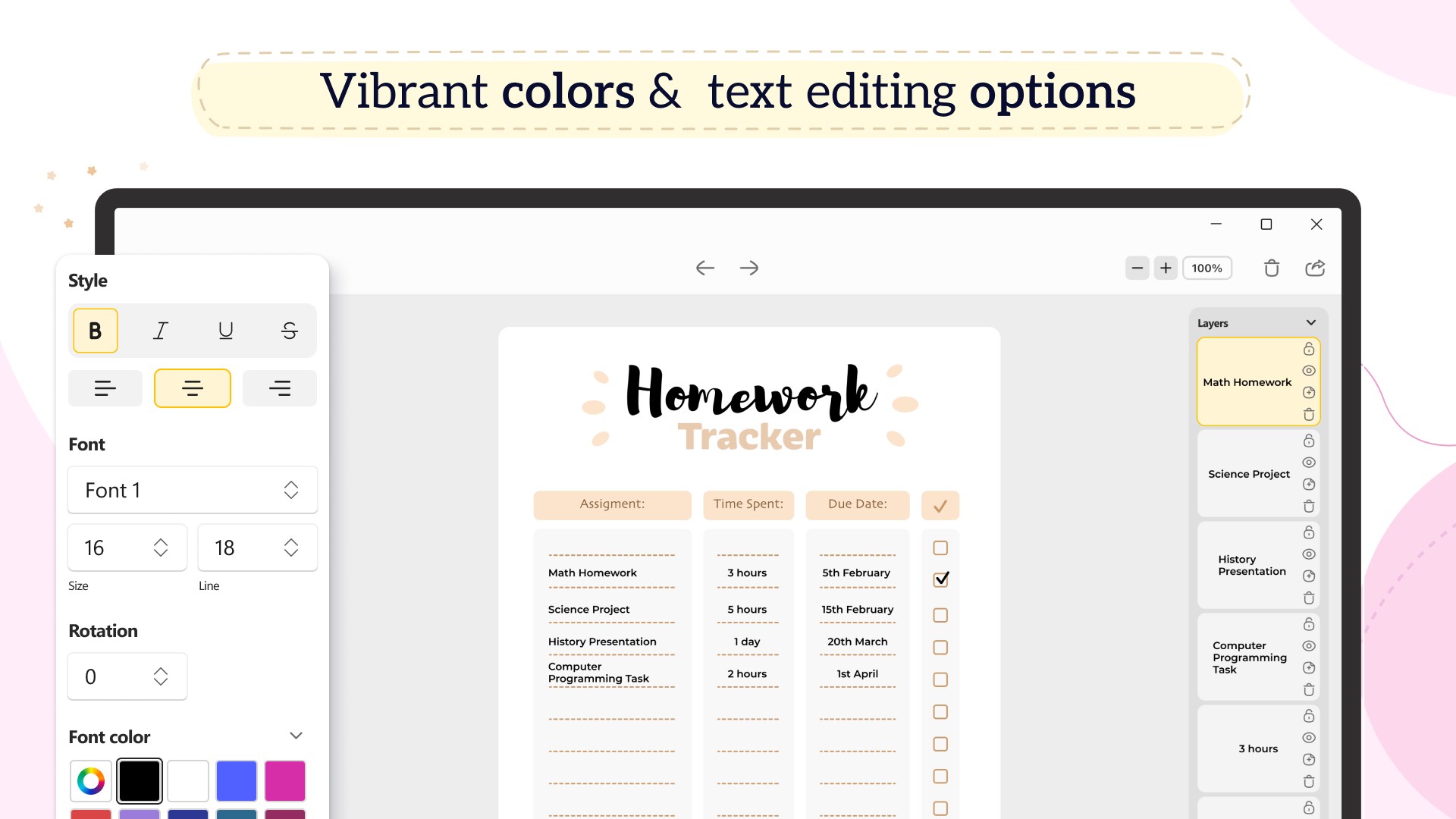 Create habit trackers, plan your day, make to-do lists and more! Boost your knowledge with reading and movie lists. Besides, to help you keep all your agenda in order, we added everything you may need during the day so that you don’t have to use several planning apps for different tasks anymore.