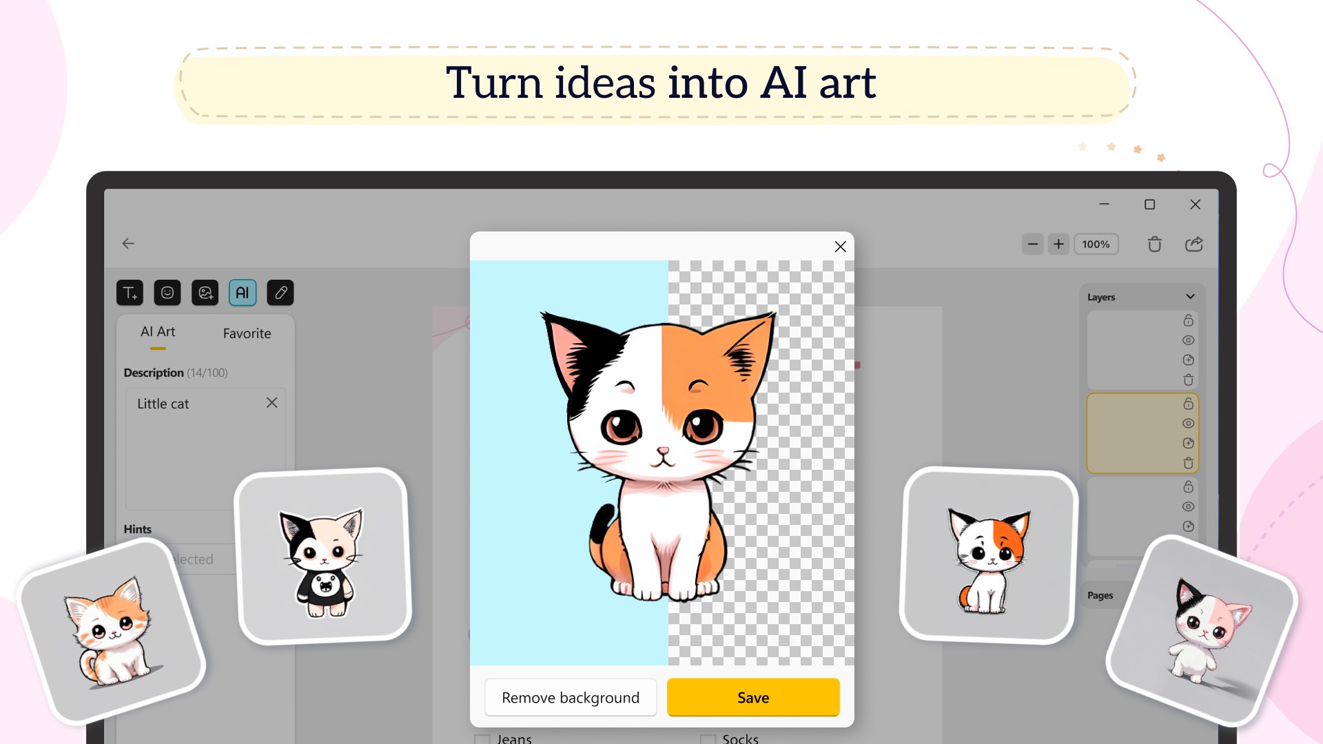 Get creative with the AI-powered feature that lets you effortlessly generate cartoon-style images by text prompts. Add them to your planner pages and transform them into stunning stickers with automatic background cropping.