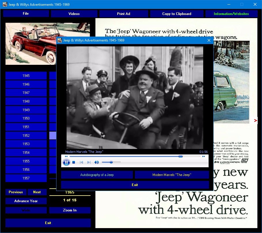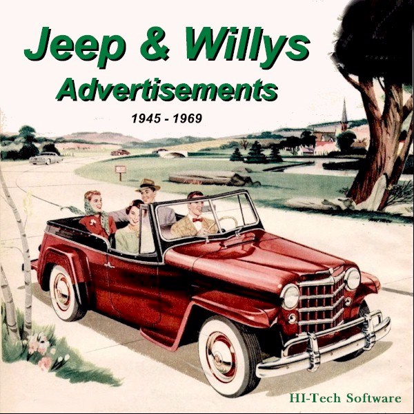 Jeep & Willys Advertisements 1945-1969. Take a nostalgic tour through history. Experience the style and hype of the automobile advertising industry from the glory days of cars. This DVD-ROM includes over 200 Jeep magazine ads as they appeared during the period. They're all here: the classic WWII type Jeep, the Jeepsters, the Jeep Wagons, the Willys autos and more. This collection of magazine ads starts in 1945 and proceeds through 1969. Also included are 2 videos chronicling the history of the famous Jeep.