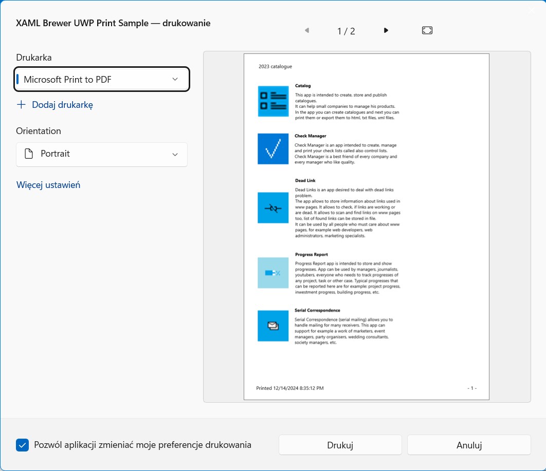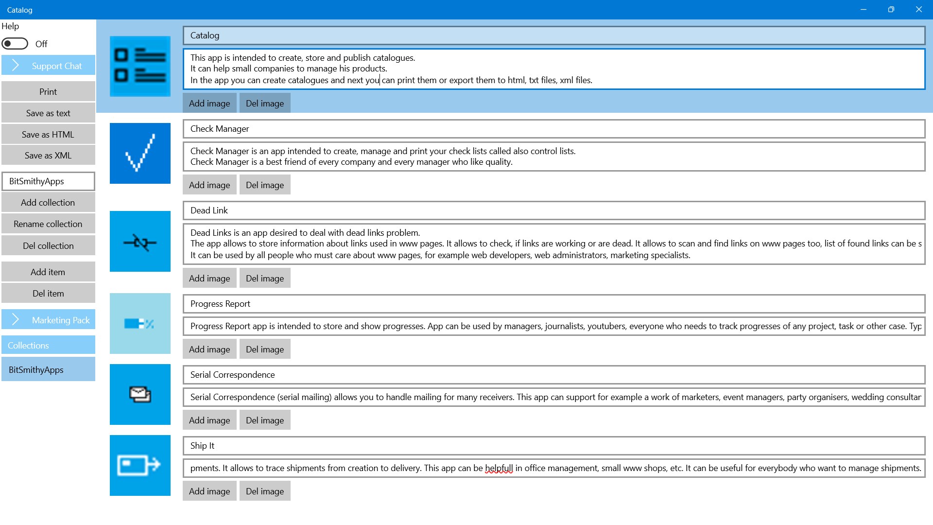 In the app you can create catalogues and next you can print them or export them to html, txt files, xml files.