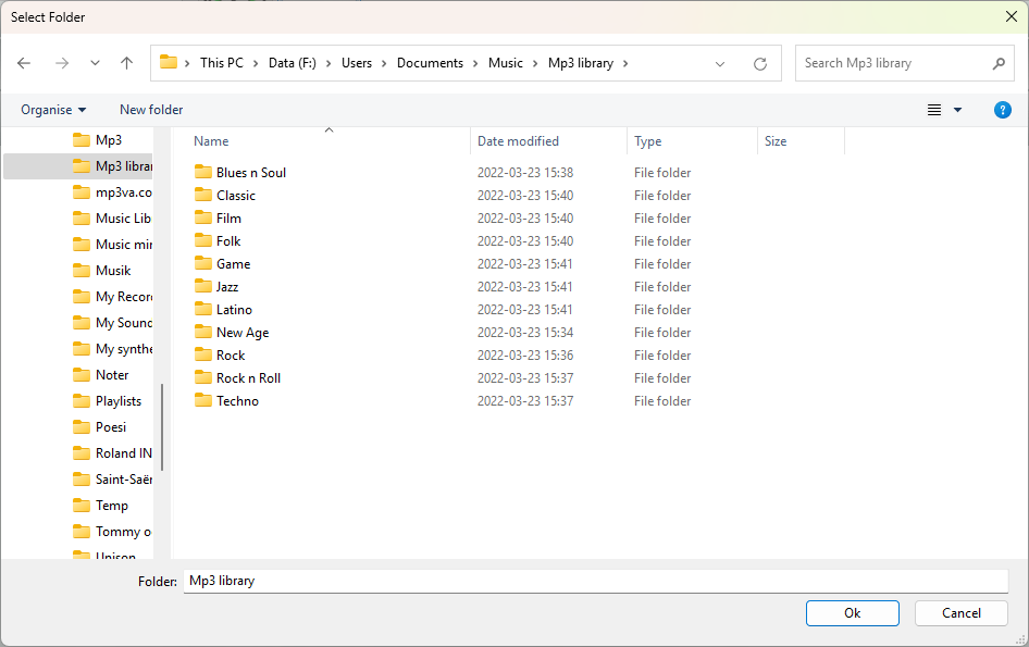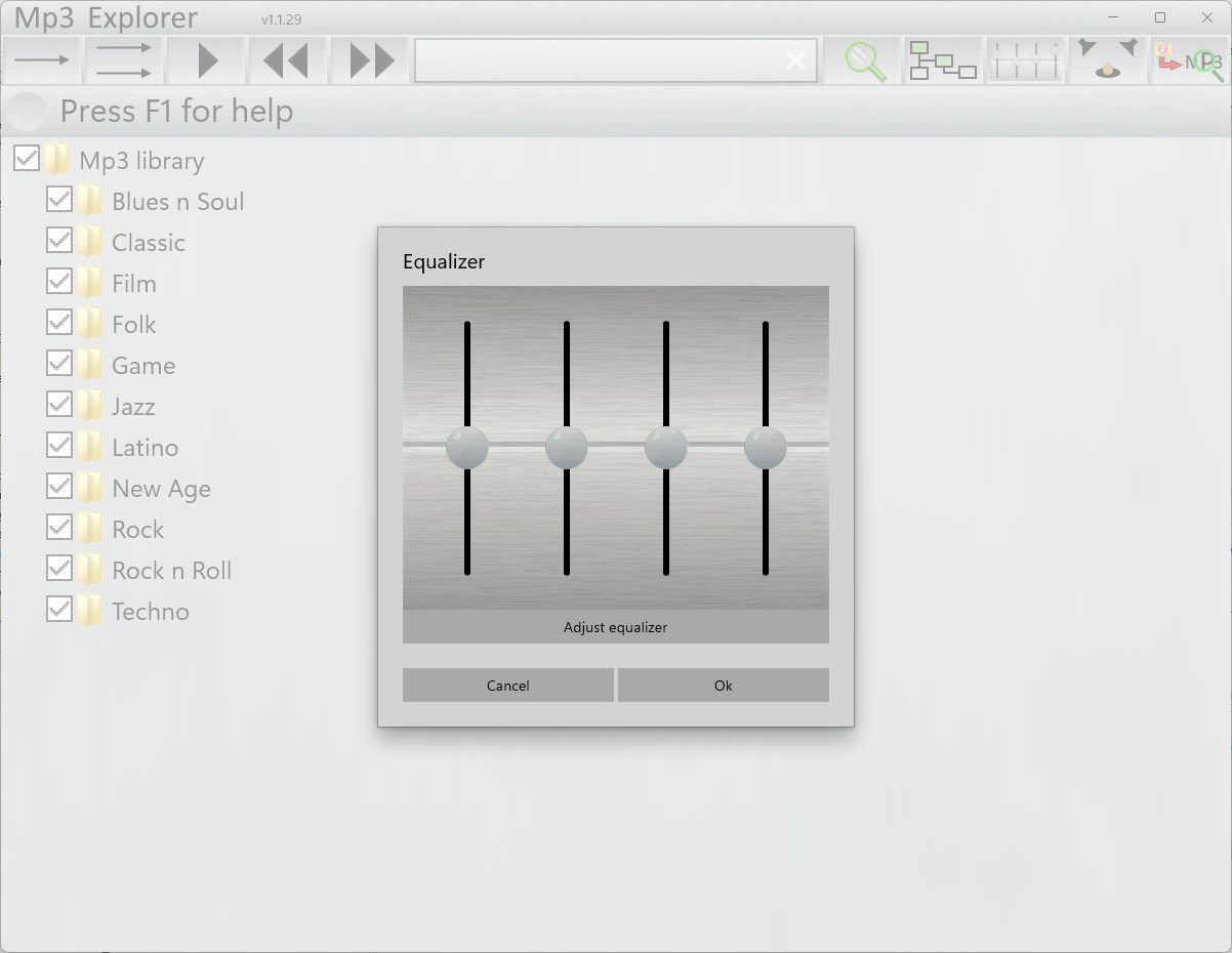 If you have stored your mp3 files in a folder arranged in subfolders etc. and wish to play the files in that folder tree rather than using mp3 tags, this is the application for you. It shows your folder with sub folders and mp3 files in a scrollable tree view where you can select files and folders to play, play in sequence or randomly, make play lists and even, if your computer has surround capacity, play your music in an artificially created quadraphonic fashion that makes the musik sound from all over you r room, not just between two speakers. For this you need to have at least a quadraphonic surround speaker setup.