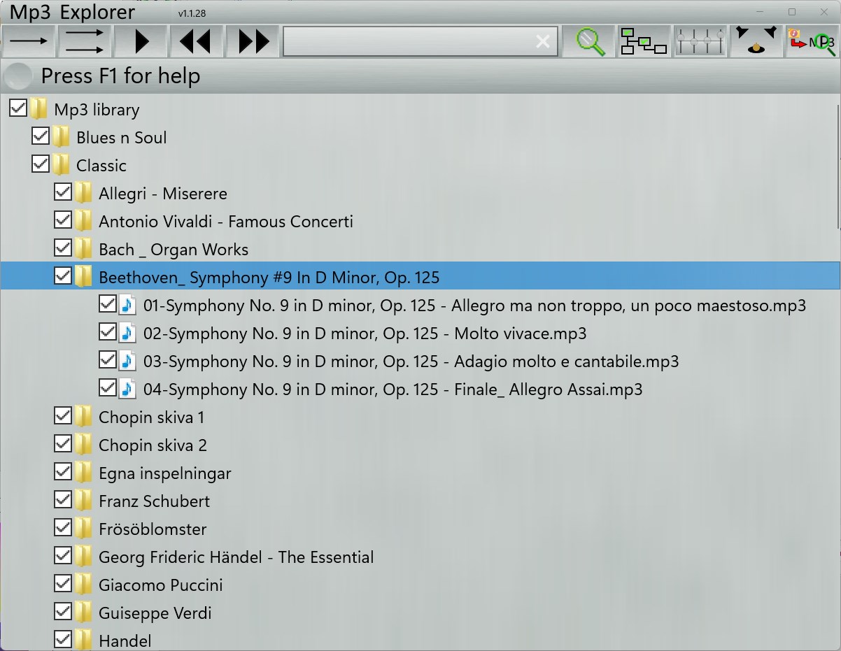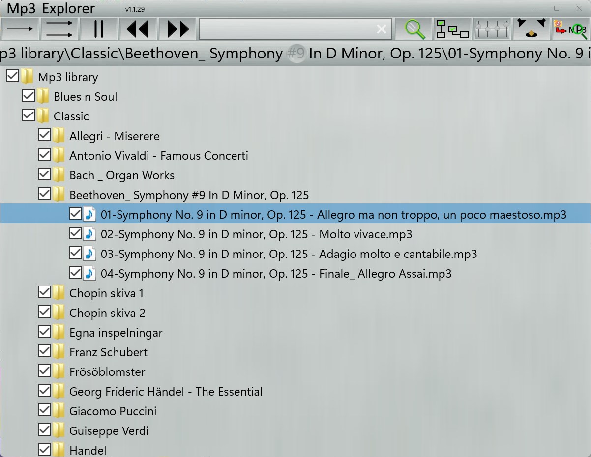 Mp3 Explorer shows your mp3 files in a tree view and plays them as you like.