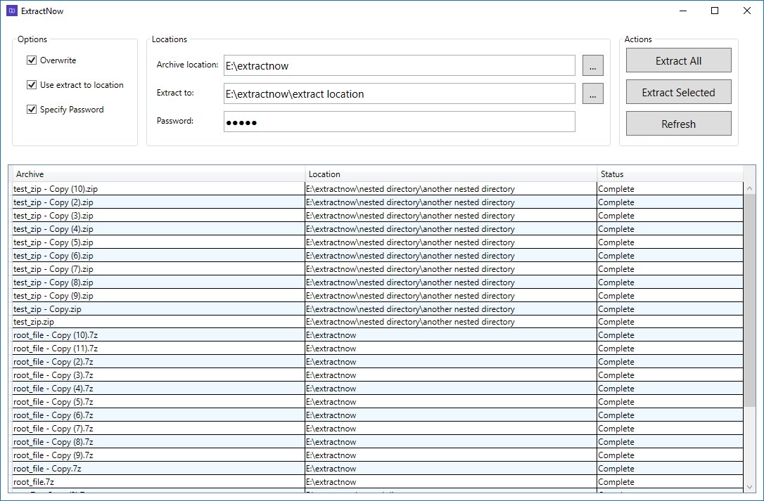 Will recursively scan and find archives in nested directoriesCan specify the location to extract toSupports password protected archivesWorks with rar, 7zip and zip filesFreeBulk extraction of archives