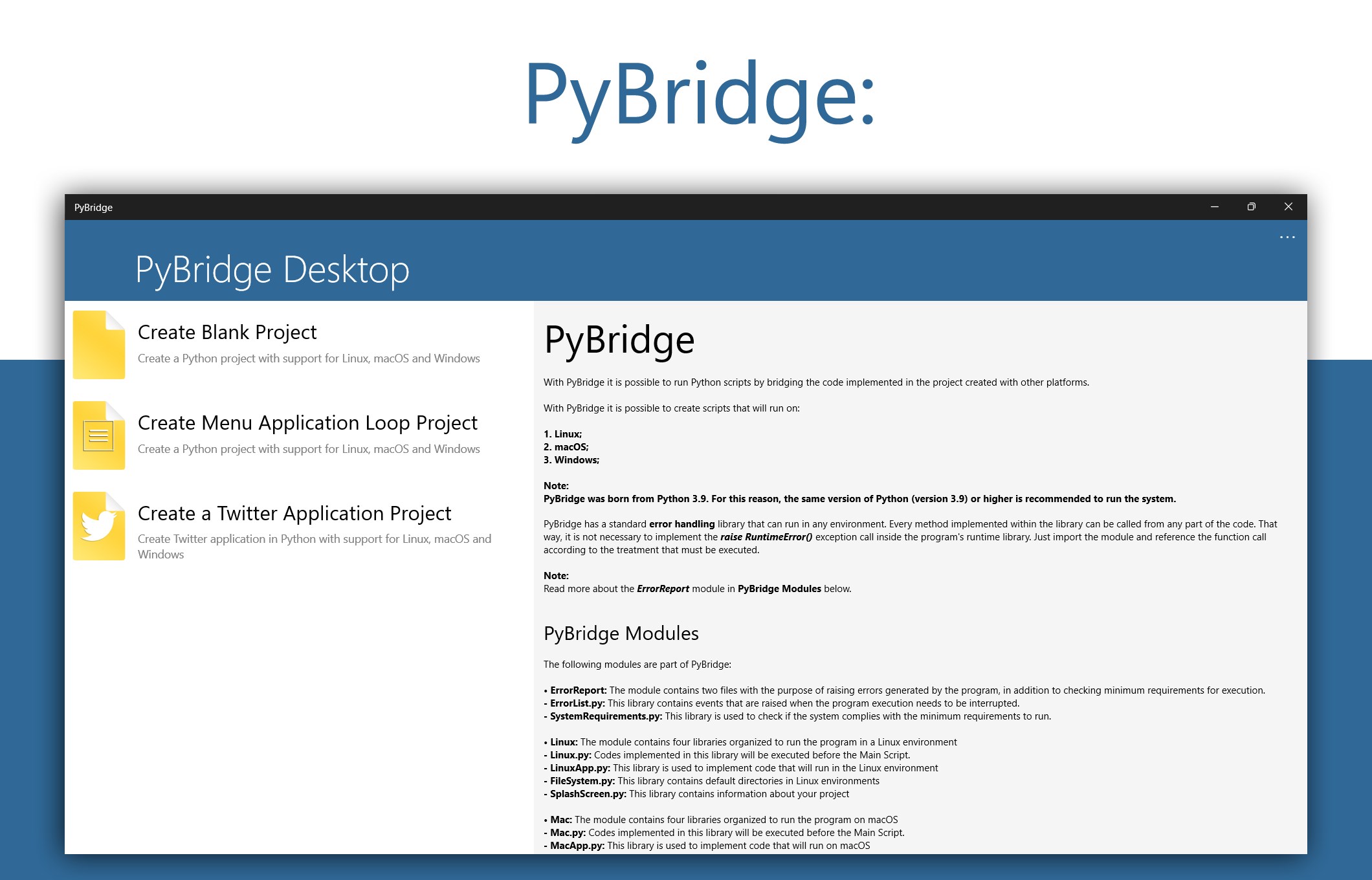 Note: PyBridge was born from Python 3.9. For this reason, the same version of Python (version 3.9) or higher is recommended to run the system.