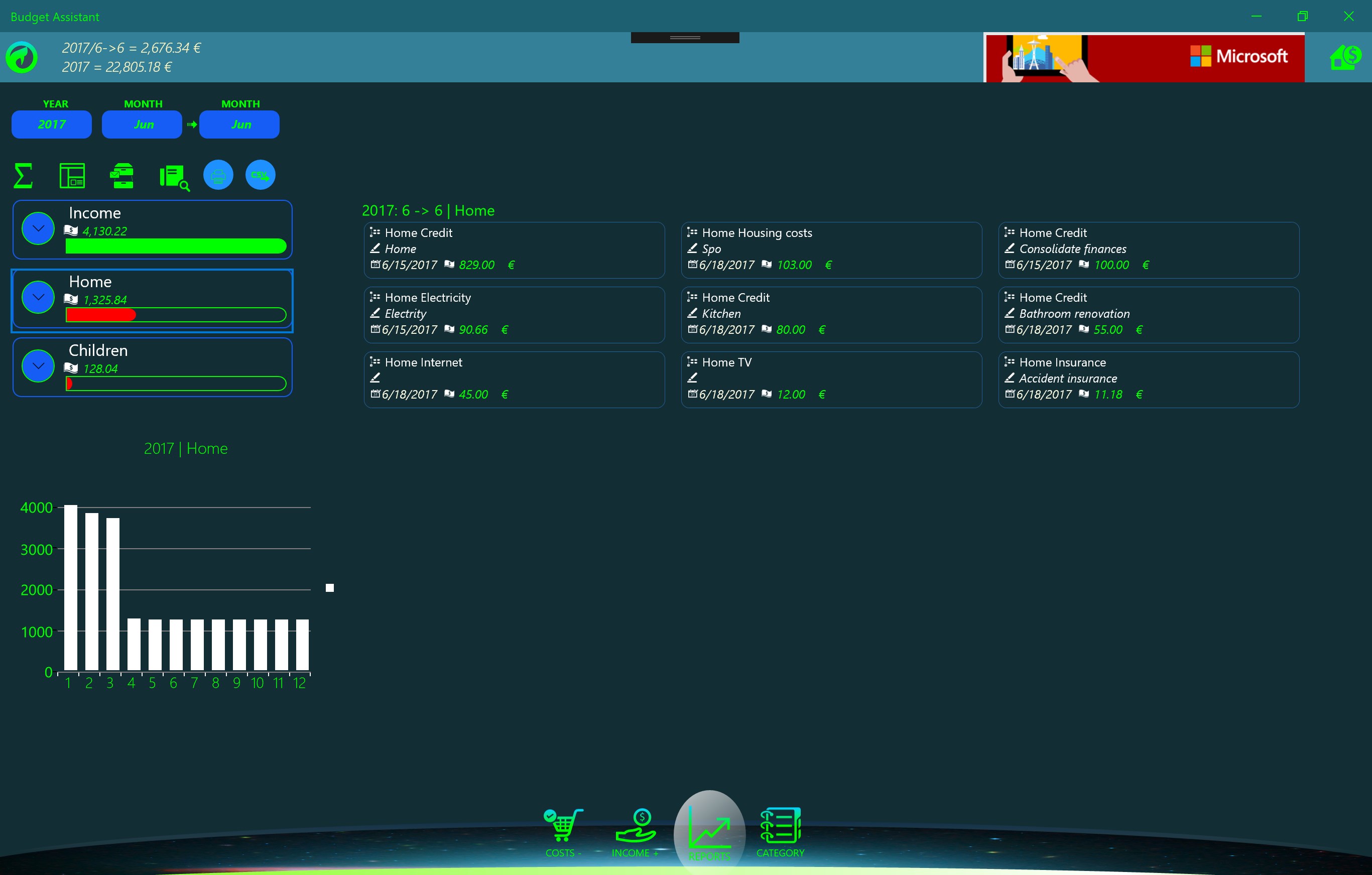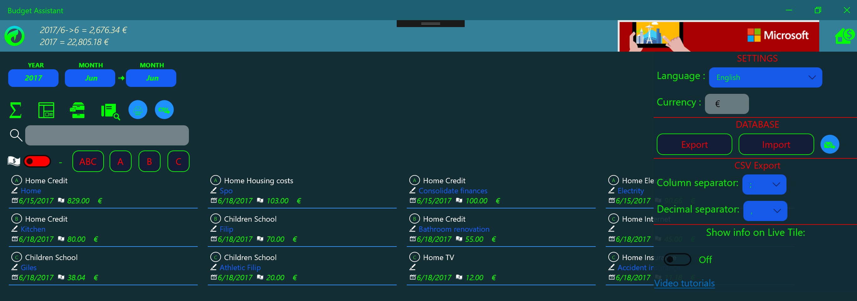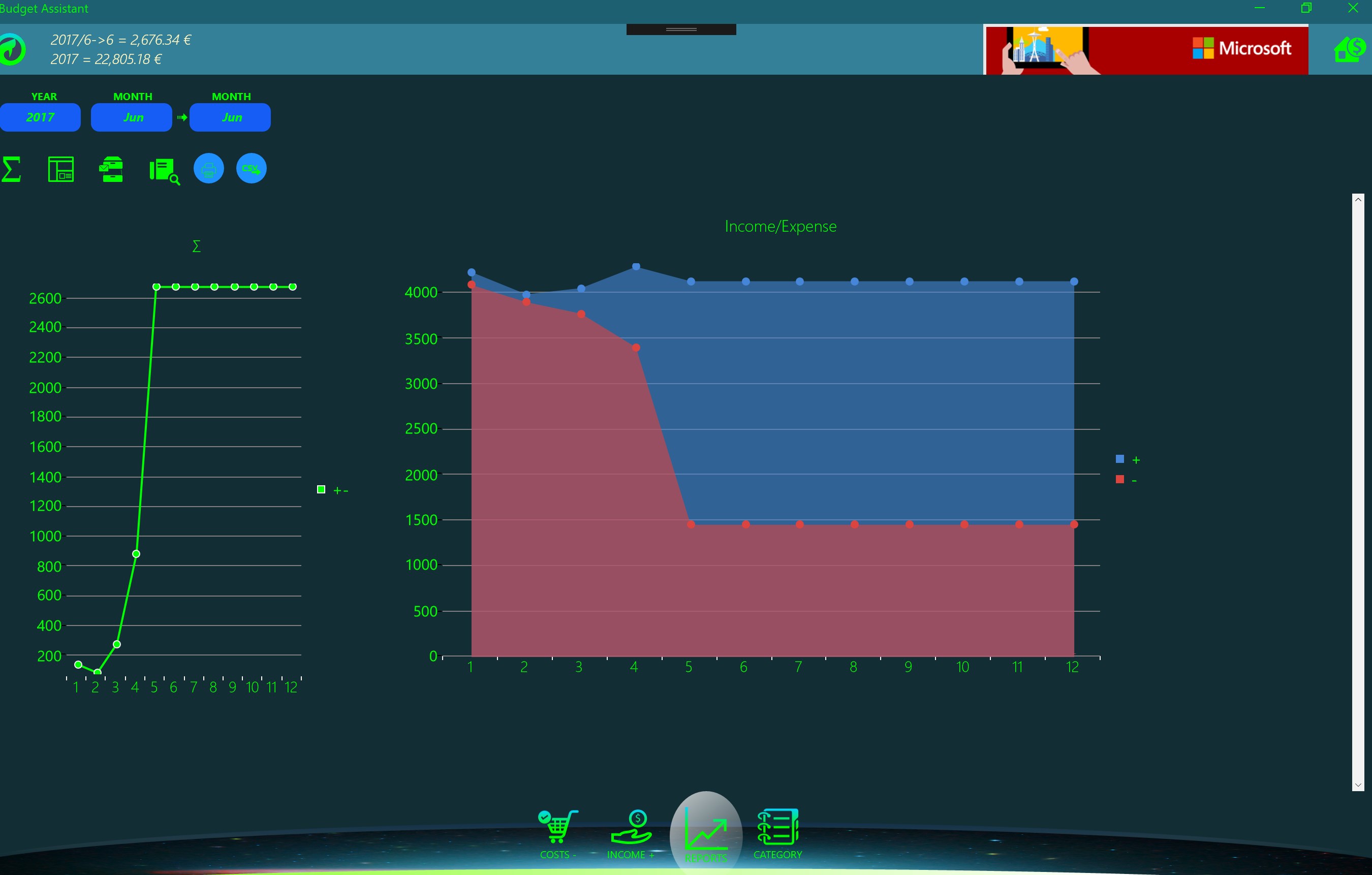 Free application for monitoring and managing the family budget. UWP platform allows you to install on handsets, personal computers and other computers running Windows 10. The application is optimized for easy entry of income and expenses that are introduced by category and are monitored on a monthly and an annual basis. It is designed as a powerful analysis in the form of graphs and reports with the possibility of exports and print reports. The purpose of the application is to manage family expenses relative to revenues. Strong analysis allow recognize critical expenditure budget.