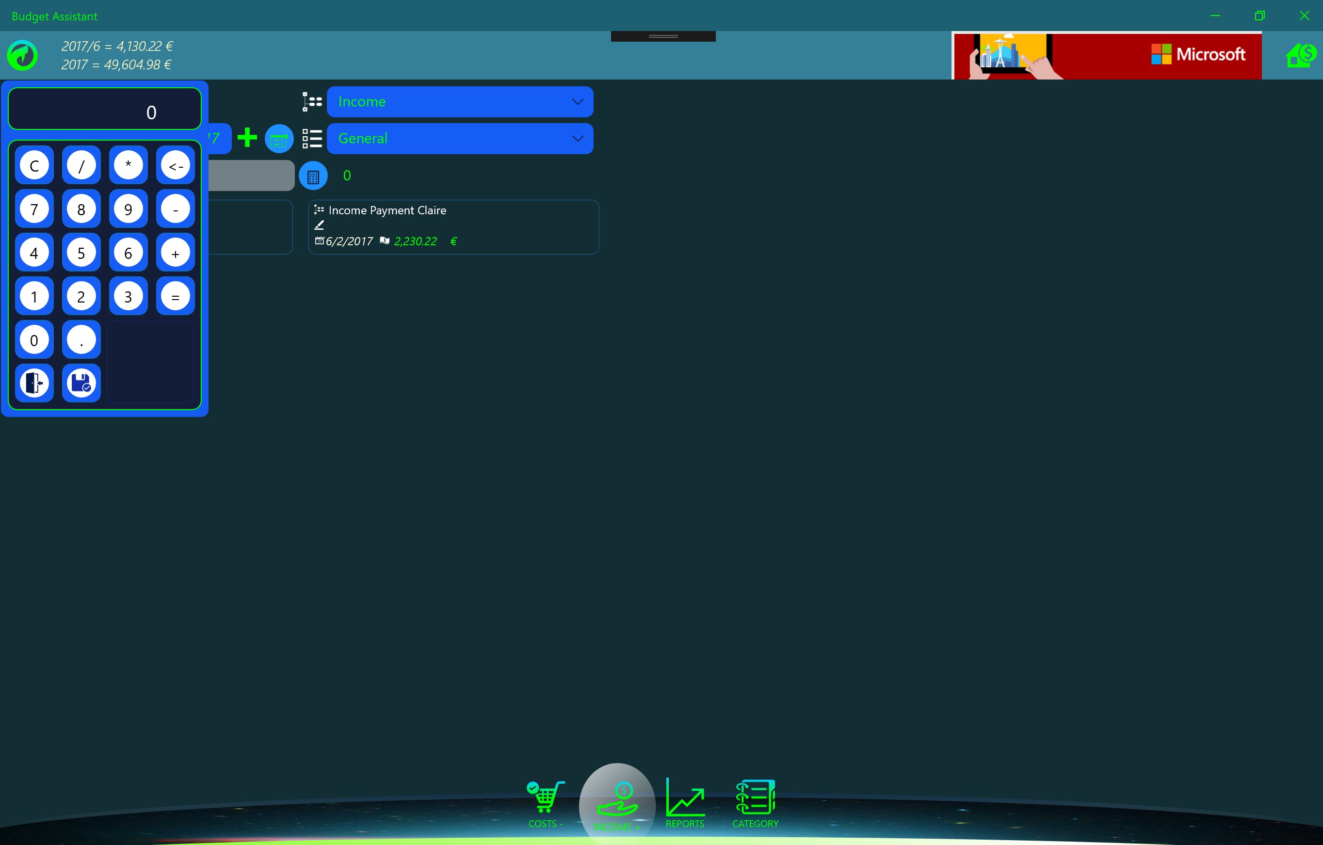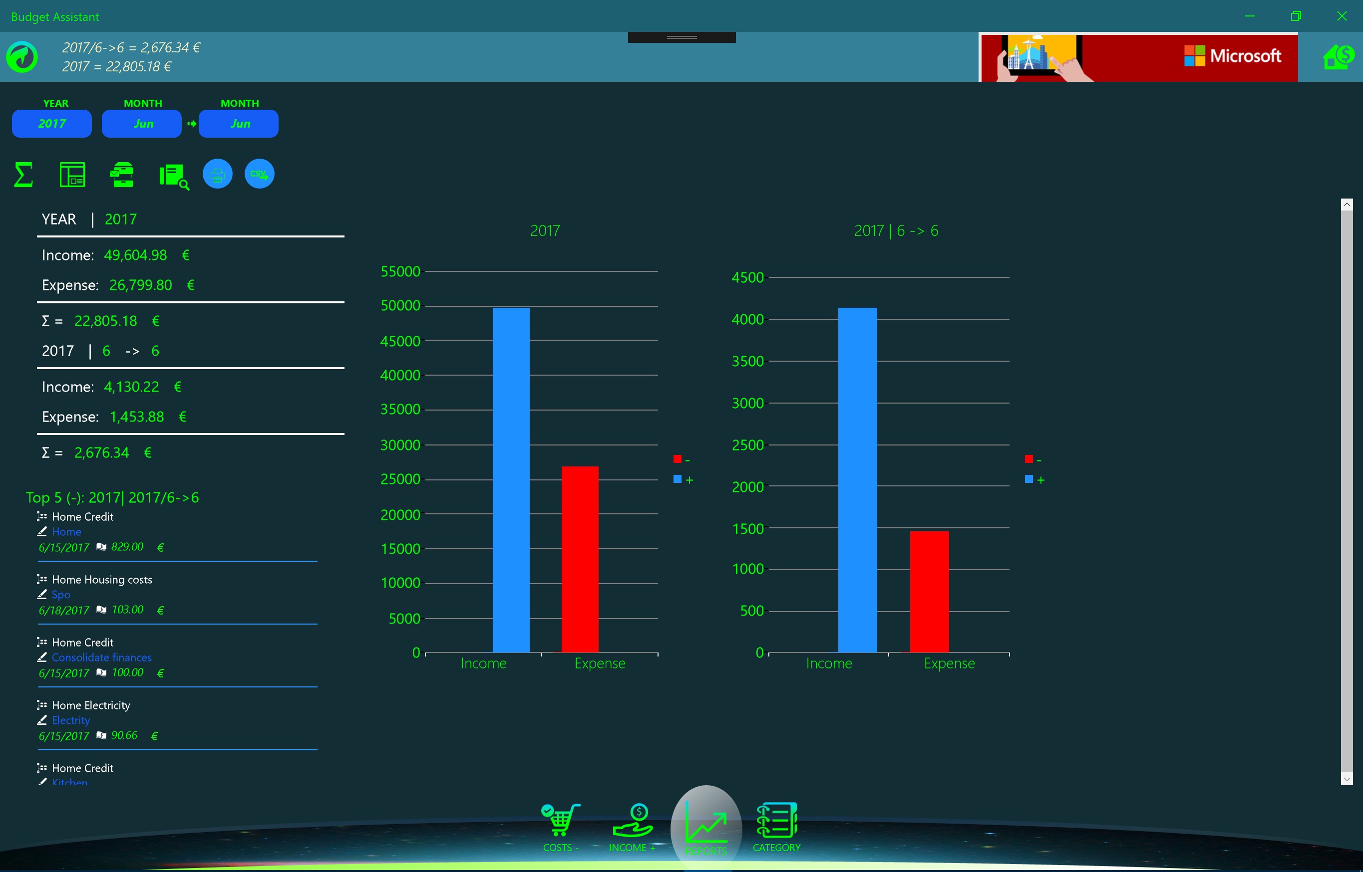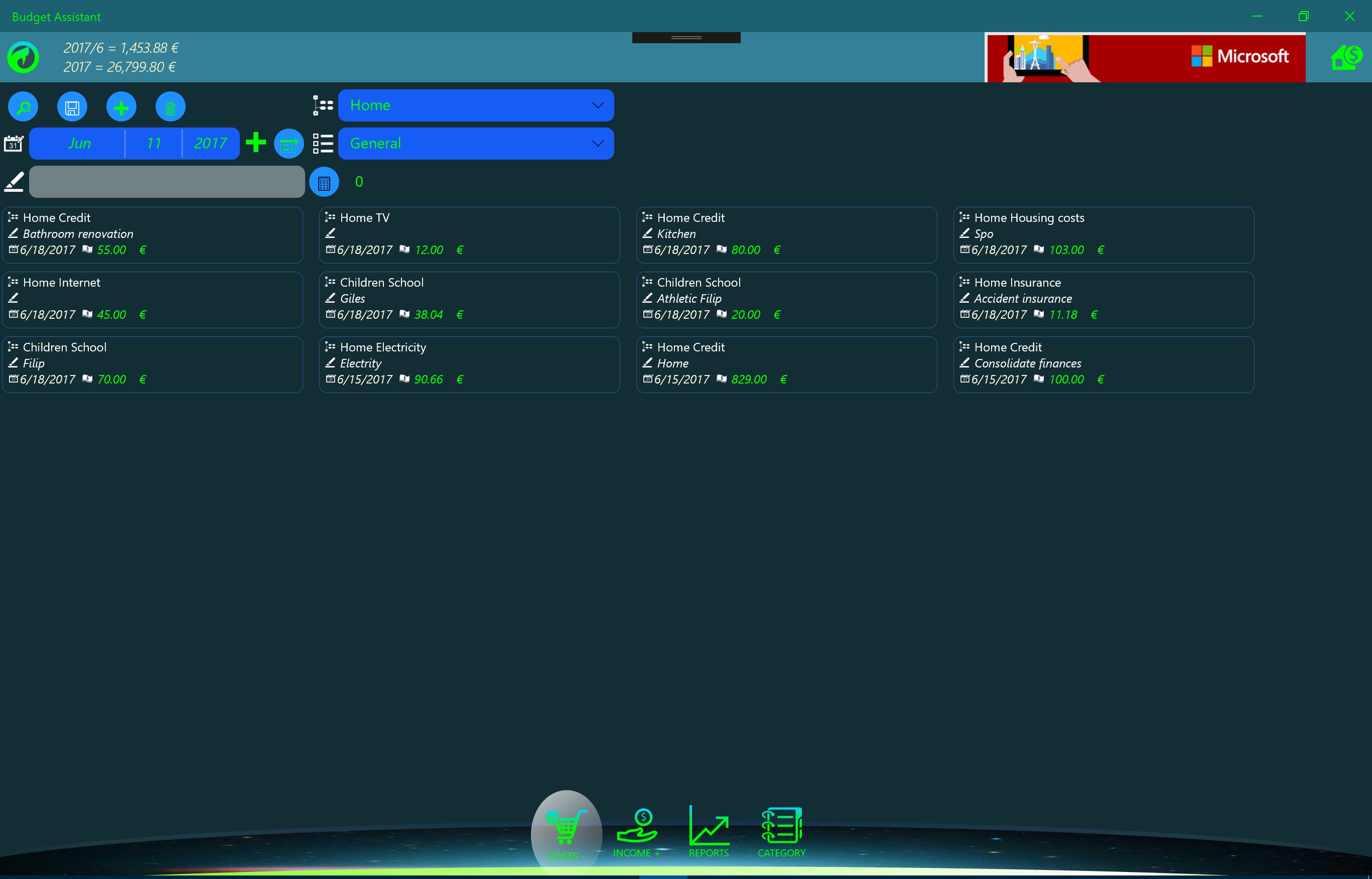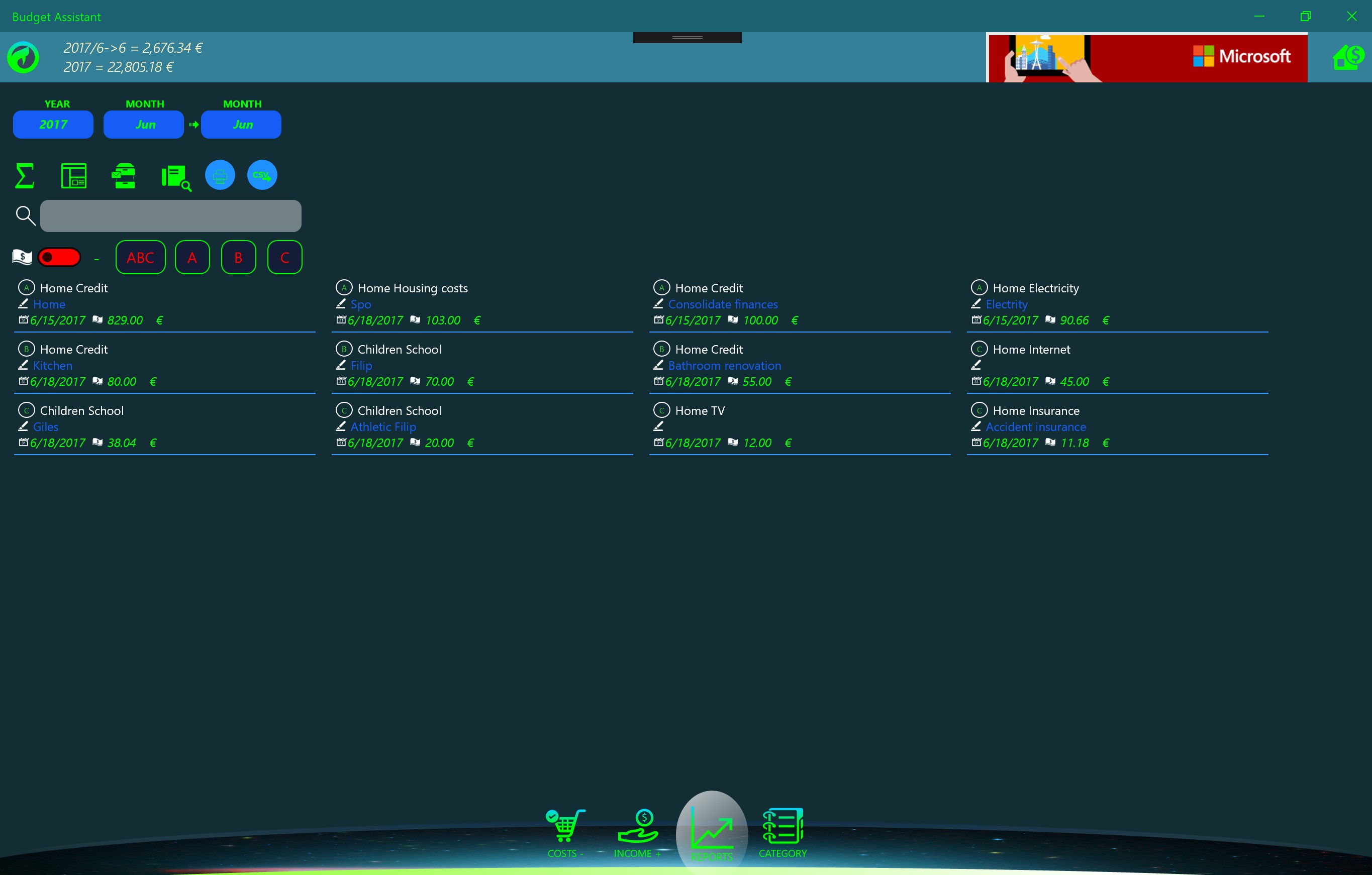 Free application for monitoring and managing the family budget. UWP platform allows you to install on handsets, personal computers and other computers running Windows 10. The application is optimized for easy entry of income and expenses that are introduced by category and are monitored on a monthly and an annual basis. It is designed as a powerful analysis in the form of graphs and reports with the possibility of exports and print reports. The purpose of the application is to manage family expenses relative to revenues. Strong analysis allow recognize critical expenditure budget.