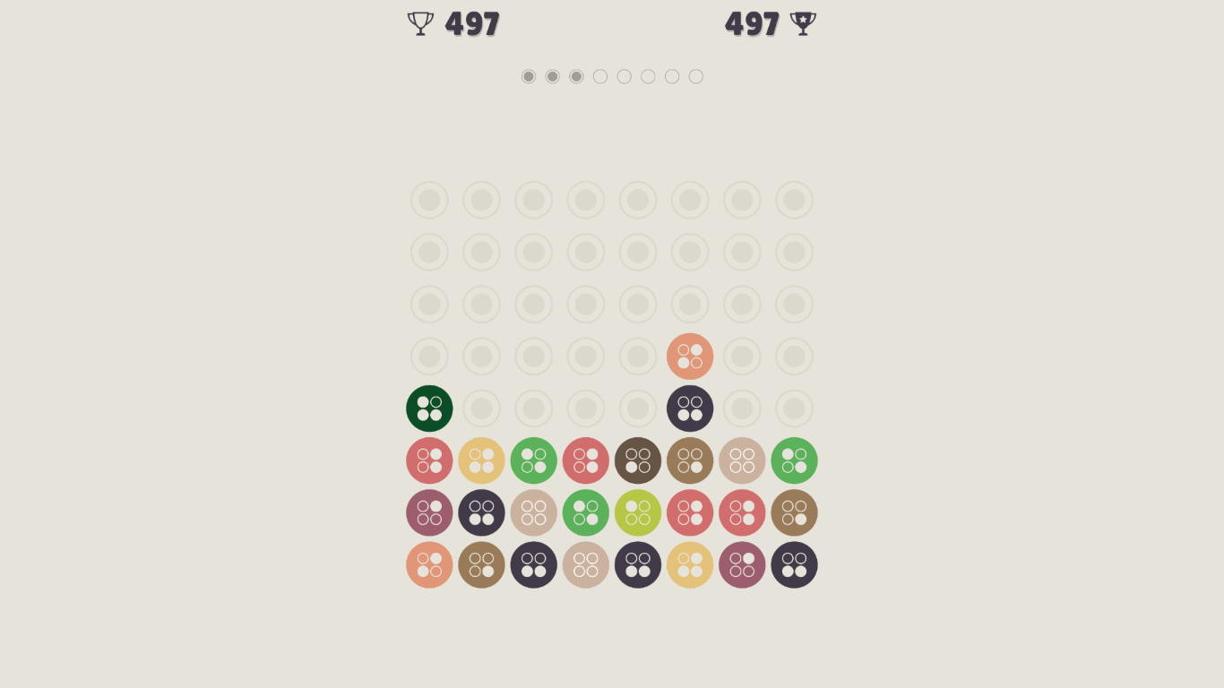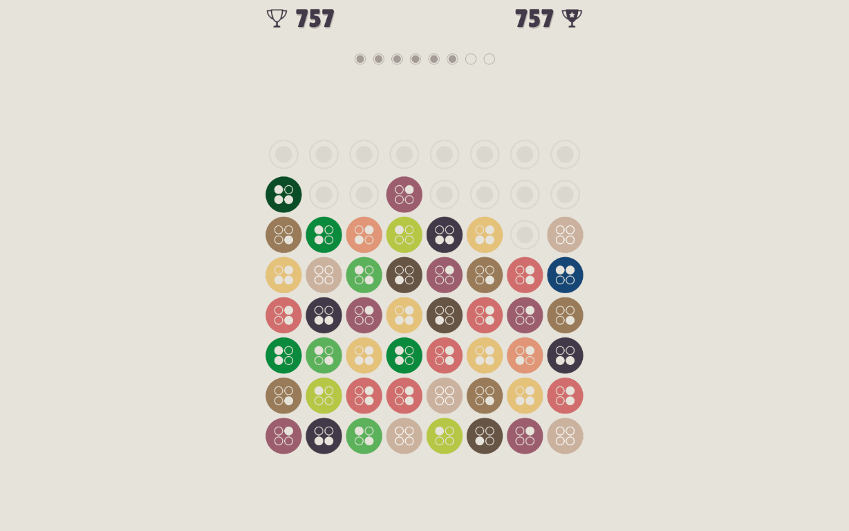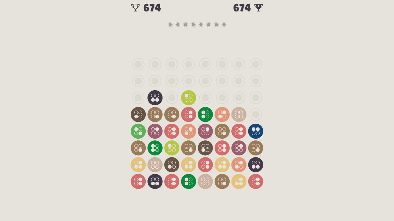 Rules of this puzzle game are very simple, each dot has a color and a number presented as a binary or decimal notation. You can stack up the dots of the same color to connect them vertically or link adjacent dots horizontally. When two dots of the same color have merged another dot with the higher number will be produced, for example if you connect two ‘ones’, then you will get ‘two’.