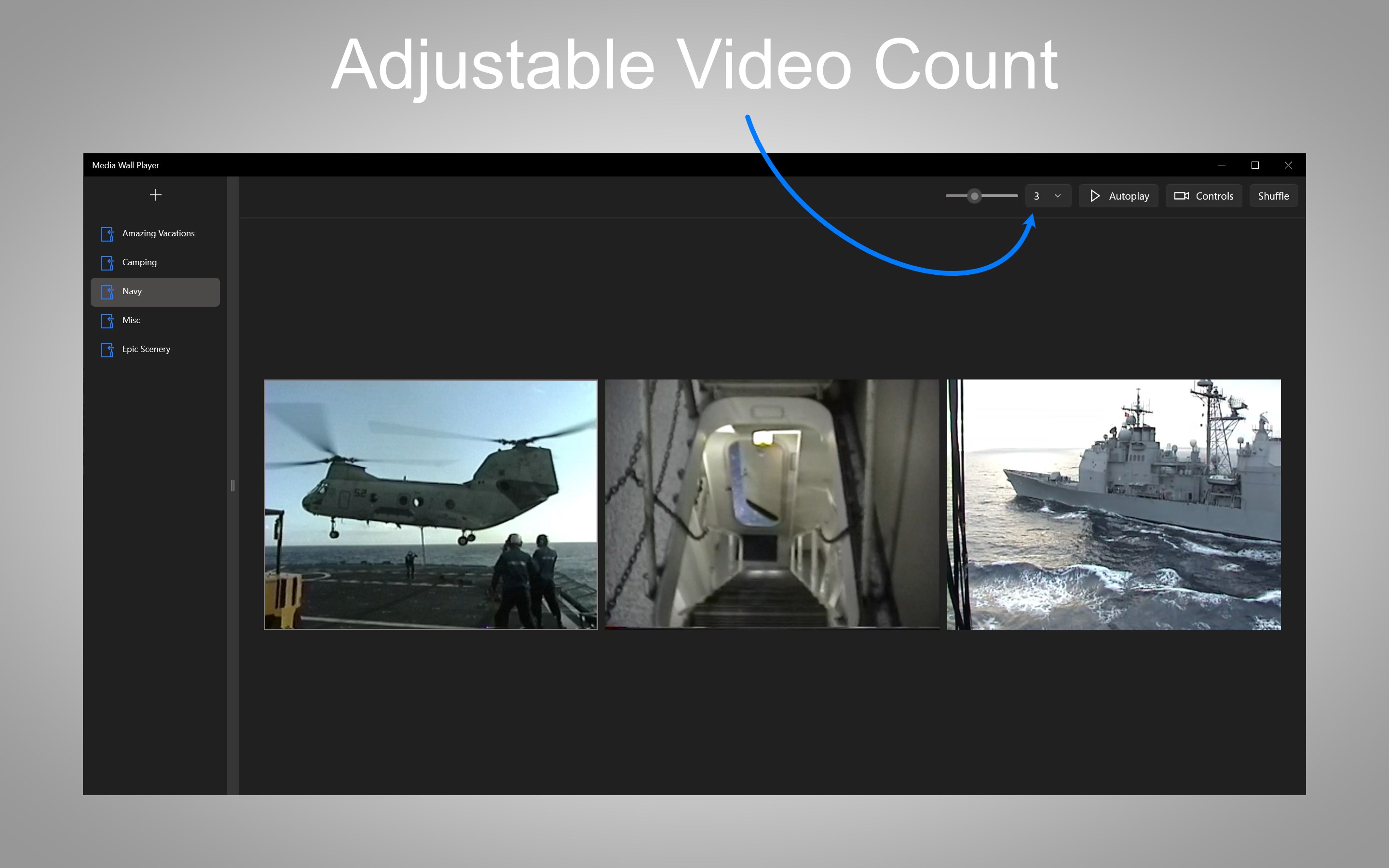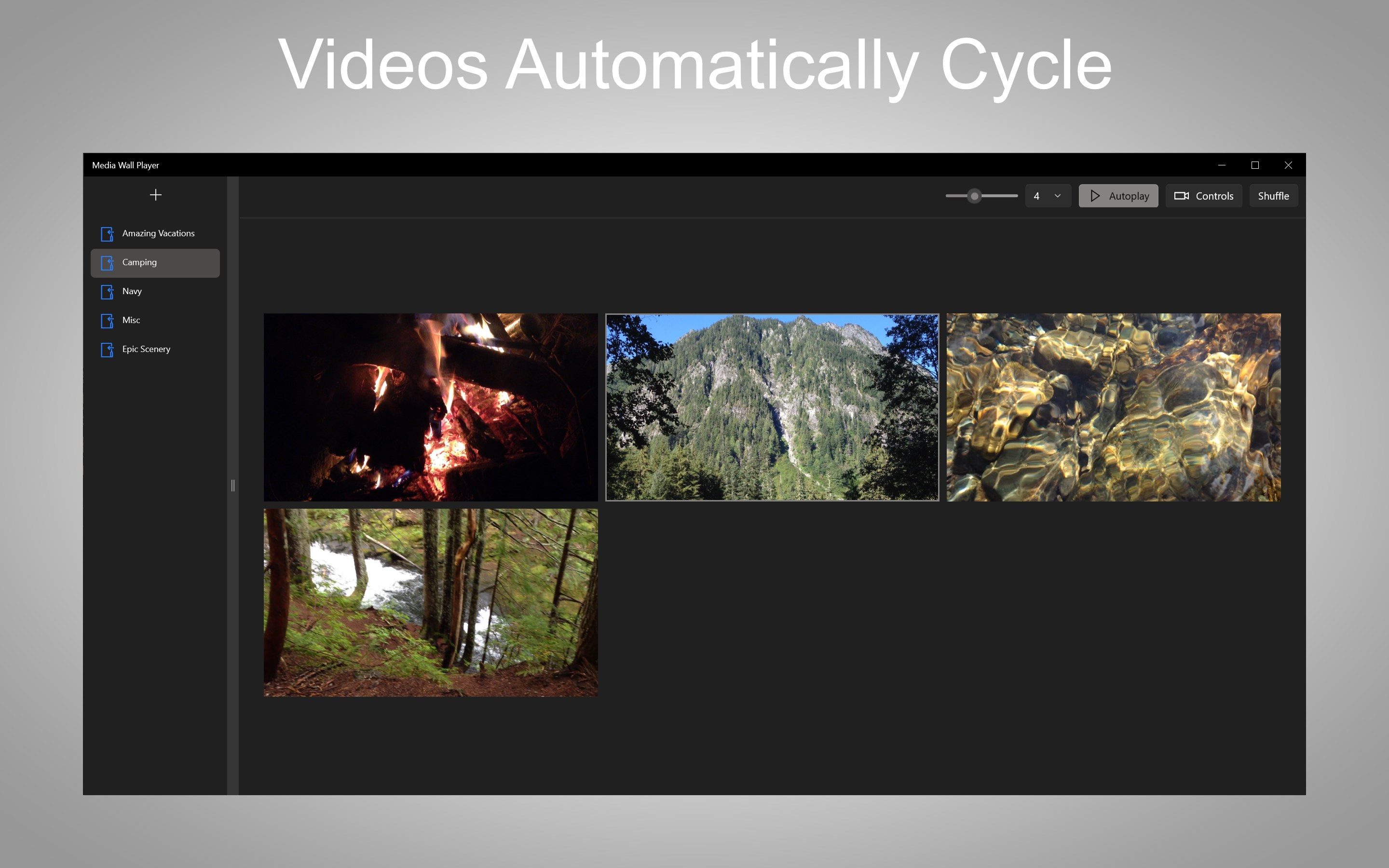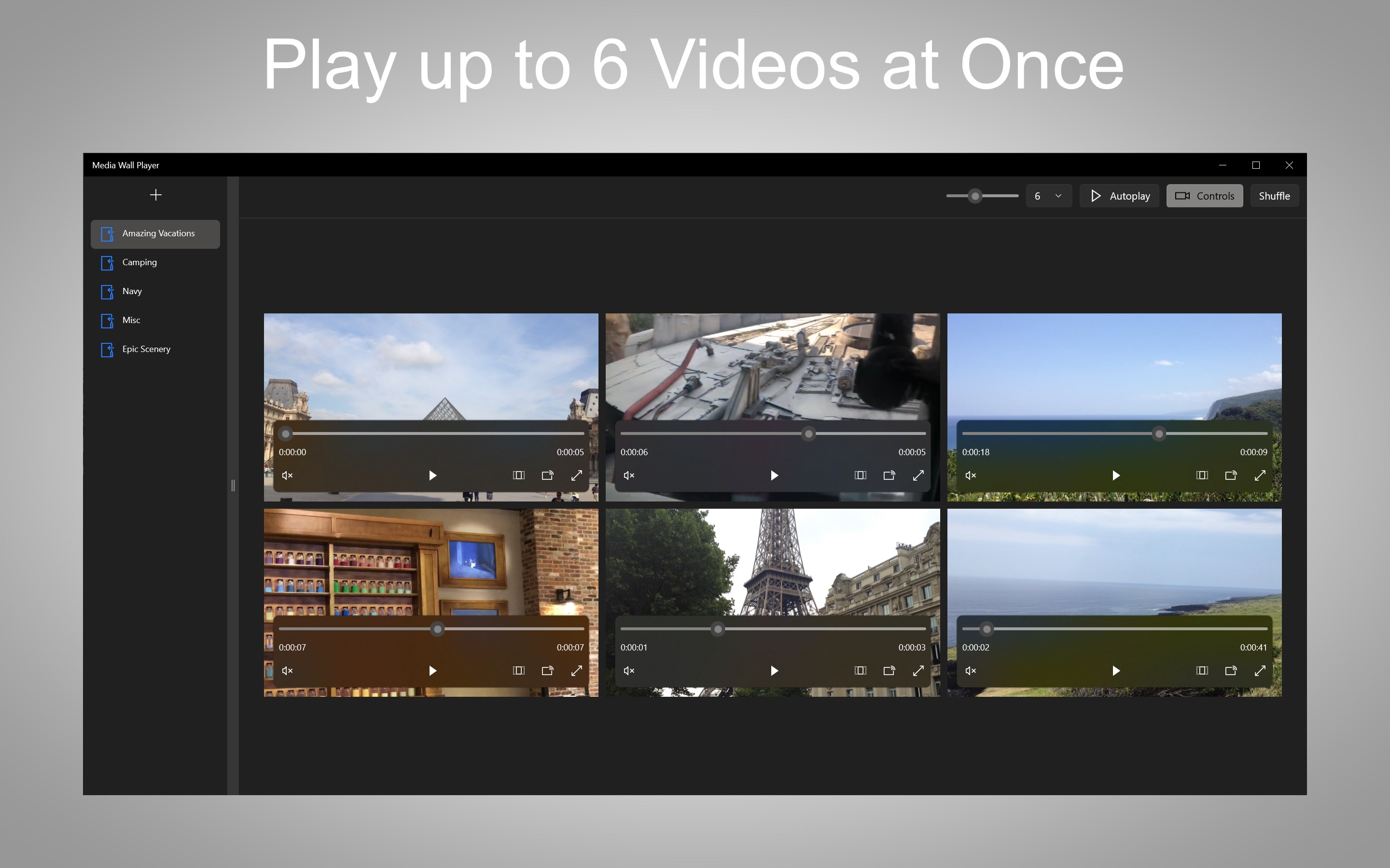 Choose directories with video files.Add, edit, reorder, or remove navigation items.Display videos in UI (1 to 6 videos).Videos will cycle to another random video when playback end time reached.Adjustable video sizing.Adjustable grid count. May be different if total video count in directory is less than grid count.Autoplay adjustable.Hide/show video playback controlsShuffle current videos to other videosStandard video controls available, including fullscreen and picture-in-picture.
