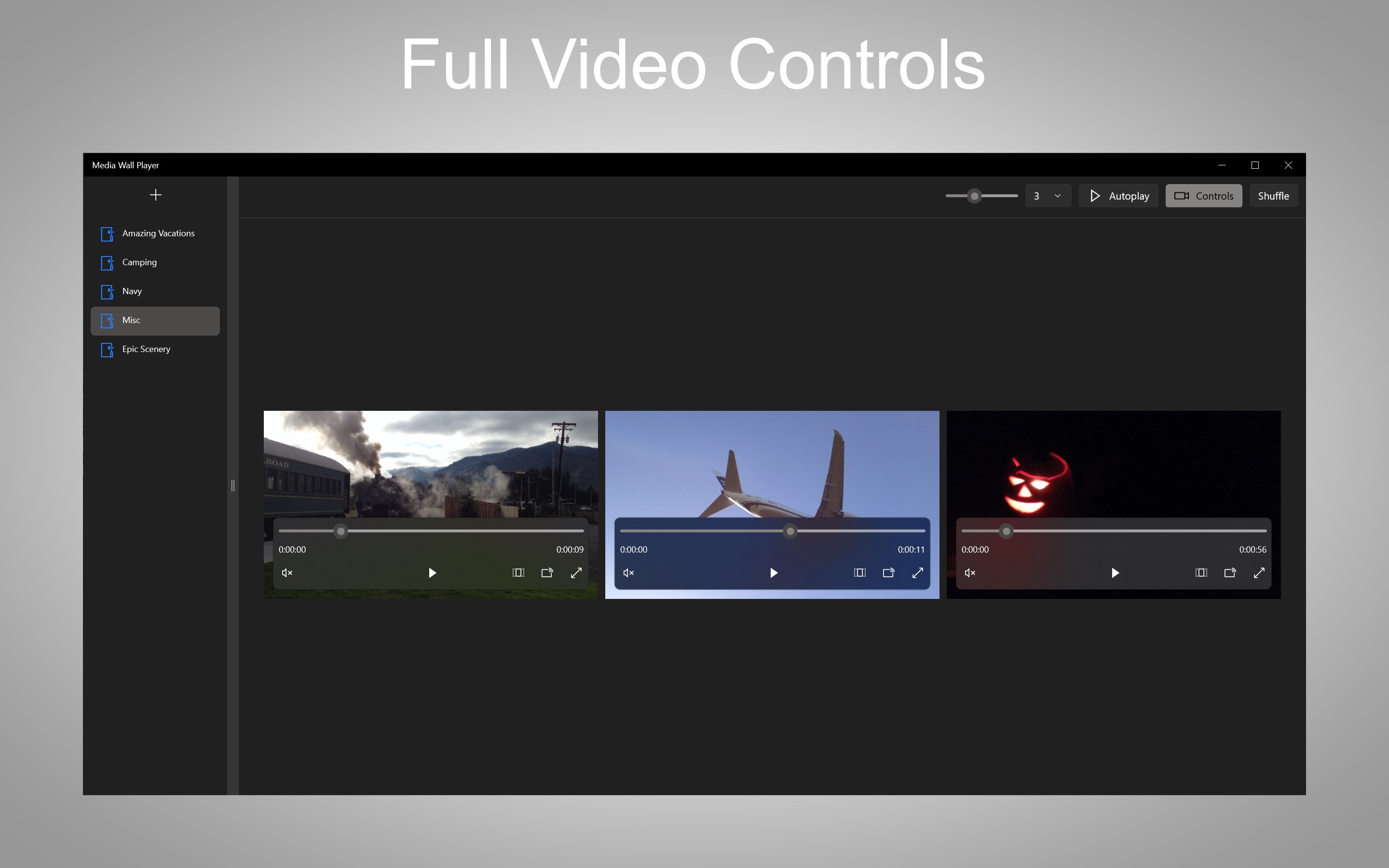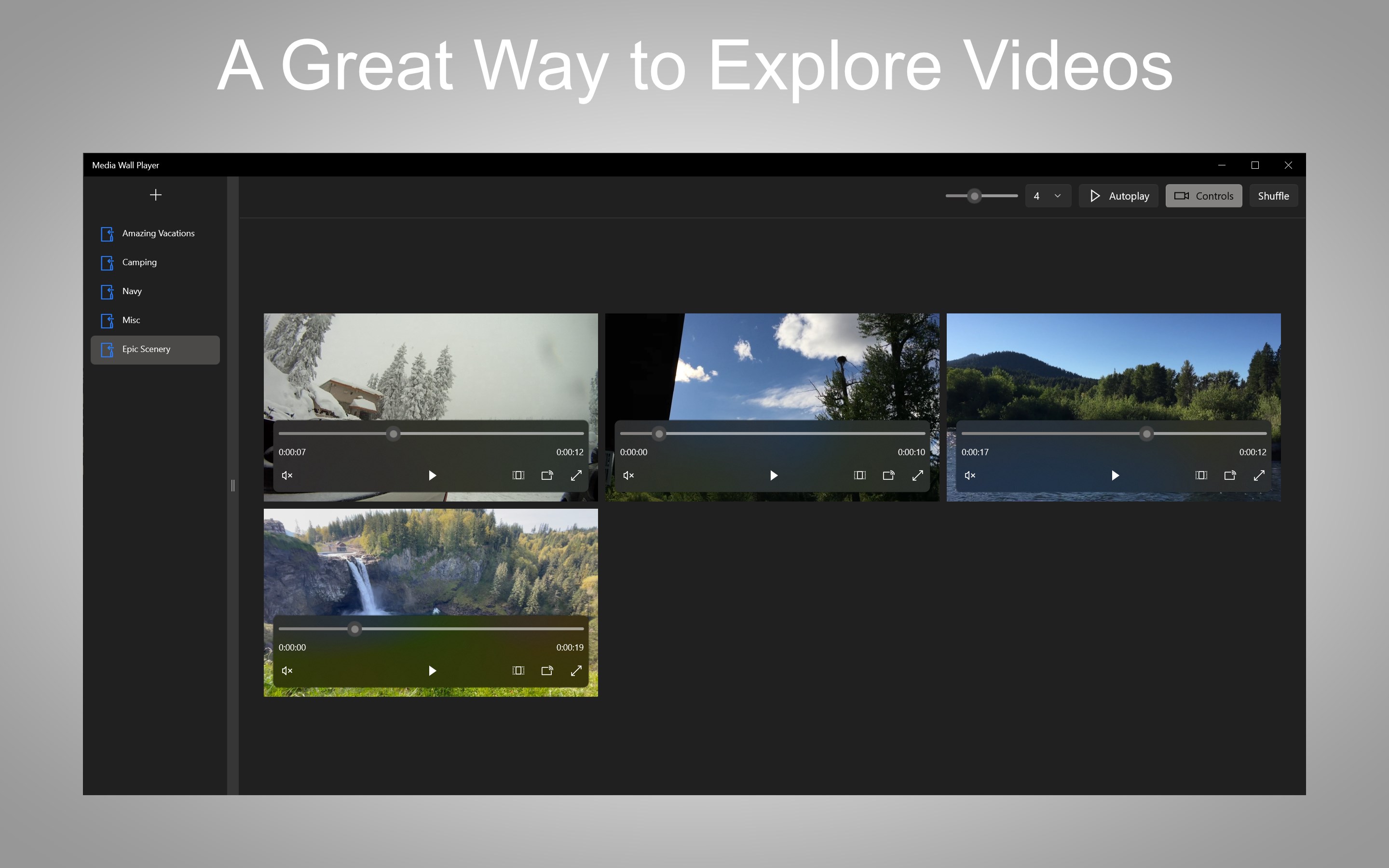 A new and modern app to display your video collections together in a media wall style. Choose custom directories containing video format files. Media Wall Player will automatically cycle videos in the UI randomly. This is a great way to present video clips to a group of people or have playing in the background.