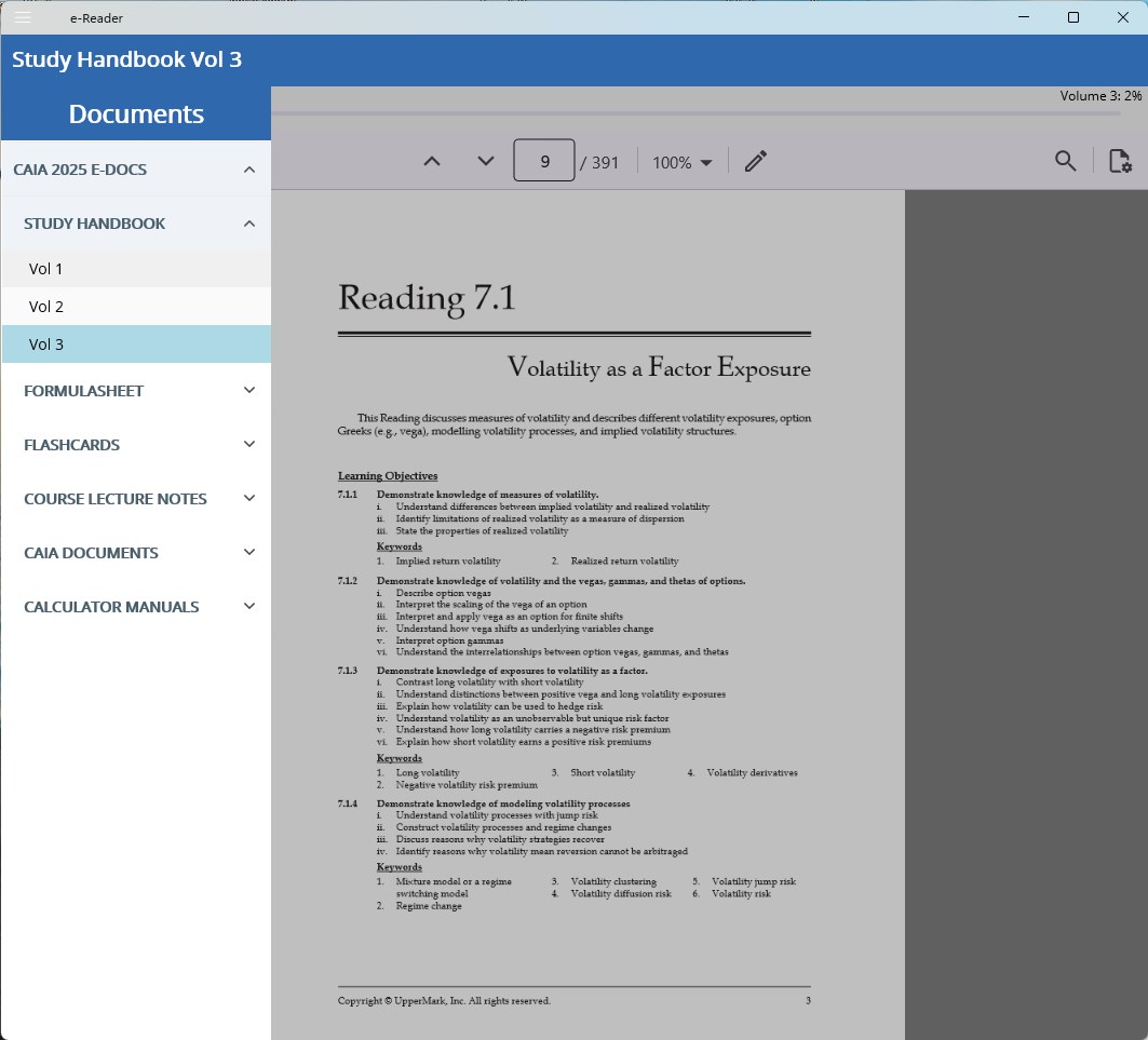 UpperMark e-Reader is for accessing the UpperMark e-Study Handbooks, course lecture notes, and associated documents for preparing for the CAIA exams.