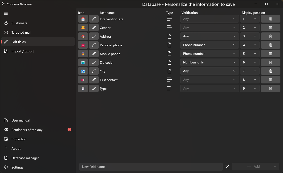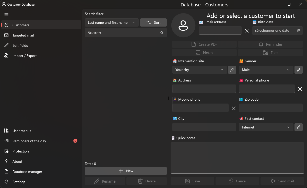 The Customers view allows you to create, delete and view customer information, send them an email and set a one-time or recurring reminder date. The file manager allows you to store all the files related to your customers directly in the database.