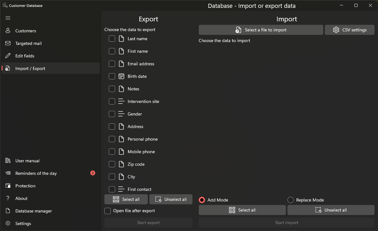Easily manage your customers and create targeted emails according to the type of person, their date of birth or meeting places. Back up as much data as you want.