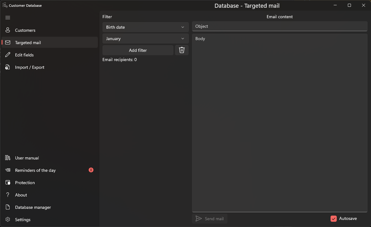 The Targeted Mails view allows you, thanks to the filter system, to simply create mails for a group of people, the mail templates are automatically saved.