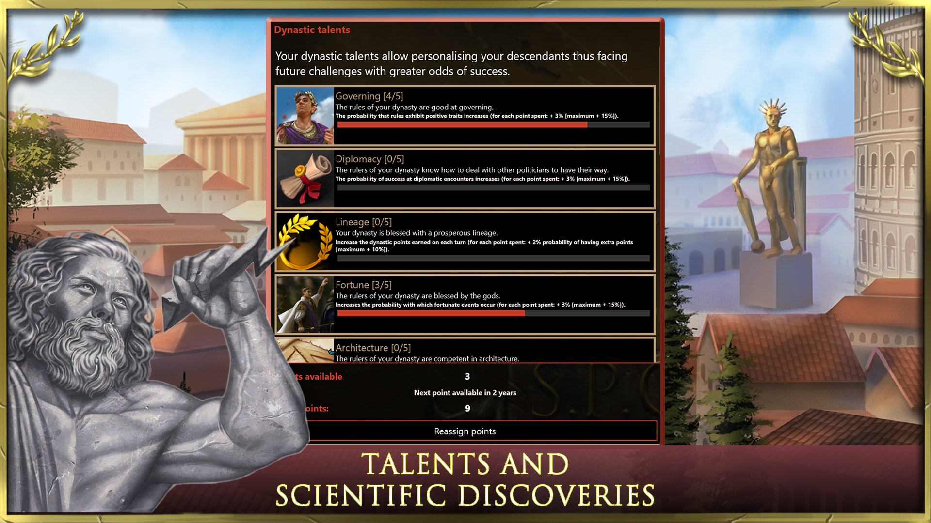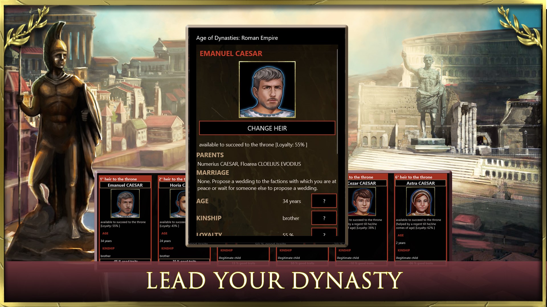 - dynasty and talented people: make your dynasty prosper under the command of your empire and prevent the establishment of the Roman Republic. Educate your heirs by strategically and tactically choosing talented people to train the future imperium to be a great conqueror and legendary emperor.
