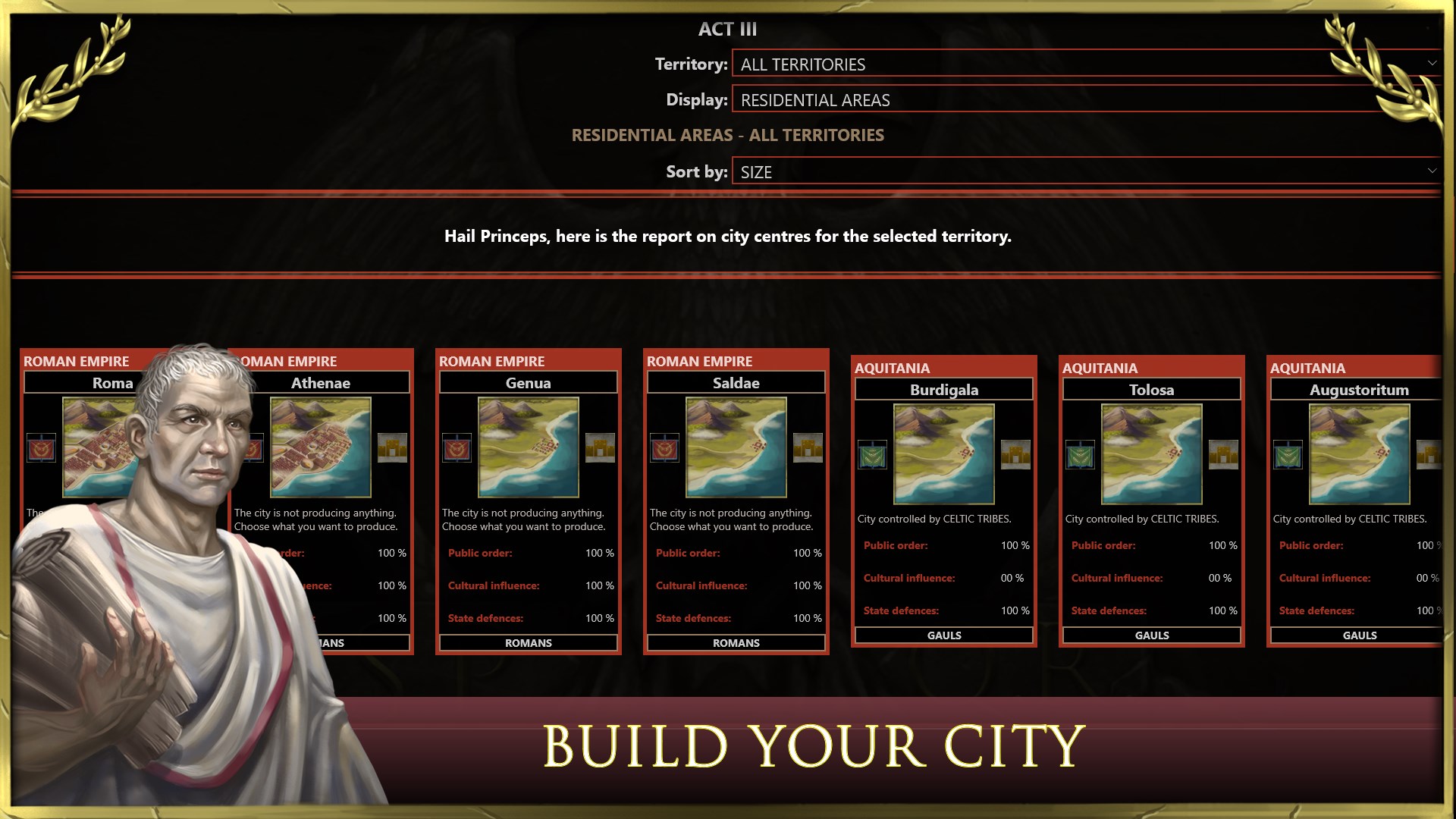 - city management: expand your cities by building imperial forums, Roman amphitheaters, aqueducts, pantheons dedicated to Roman gods, imperial villas, and fortifications.