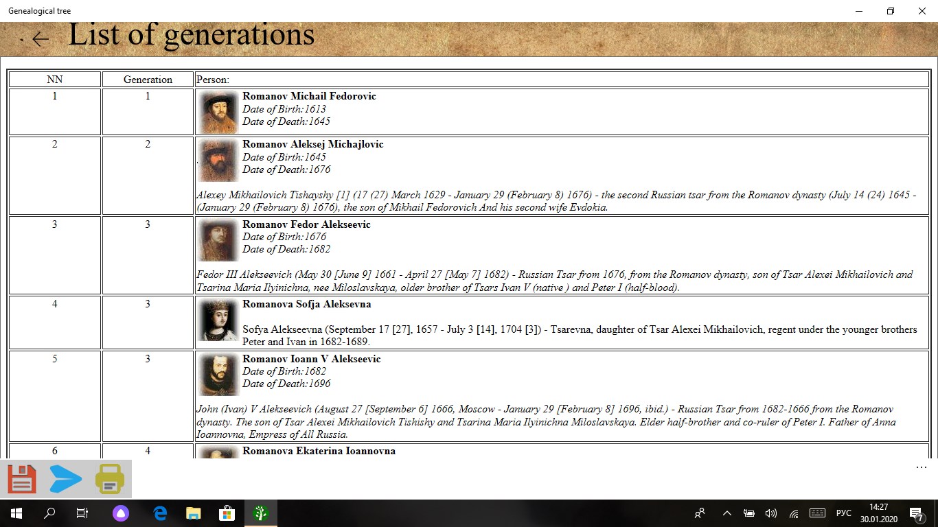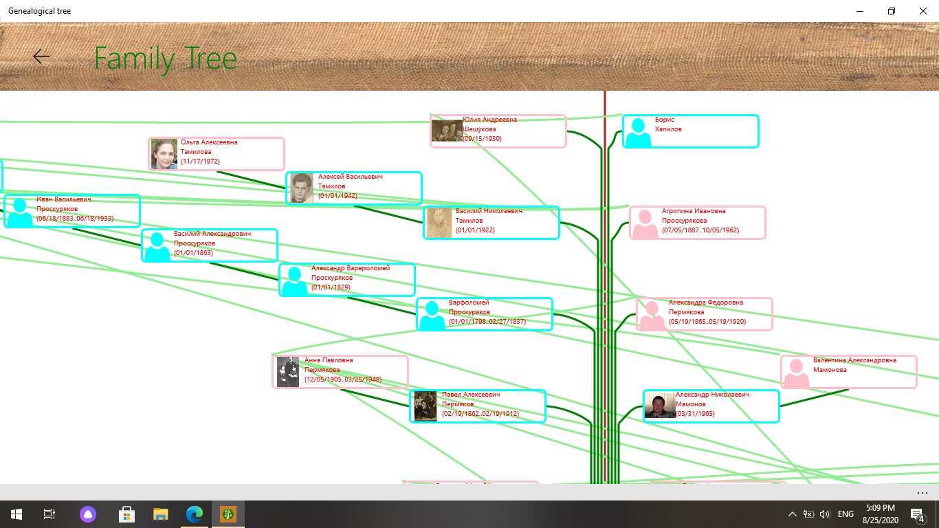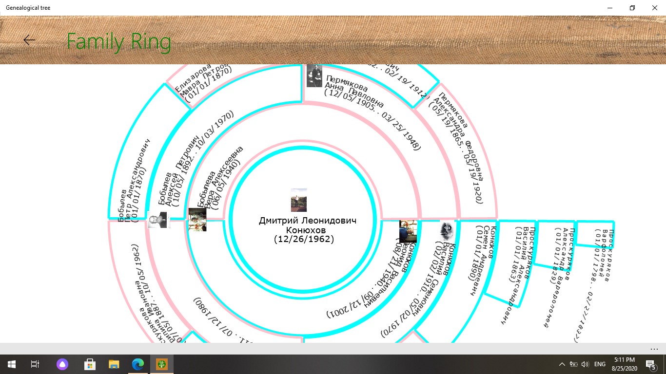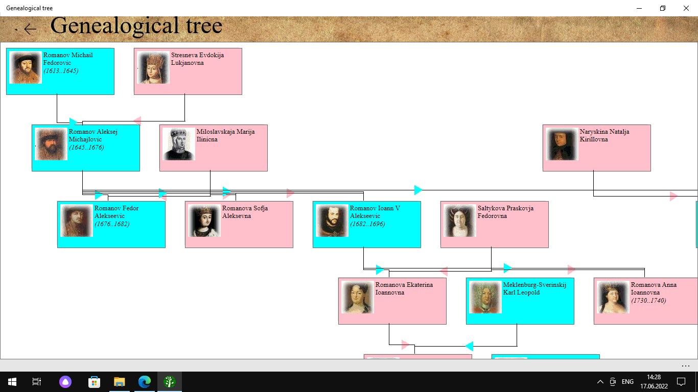The application was created to store the historical heritage of the family. Keeps a list of people and their family ties, photographs, copies of documents and videos. Draws trees on a graphics and hypertext canvas. Saves photos and videos. Shows a calendar of family events, which makes it possible to visually see the days of important family events.